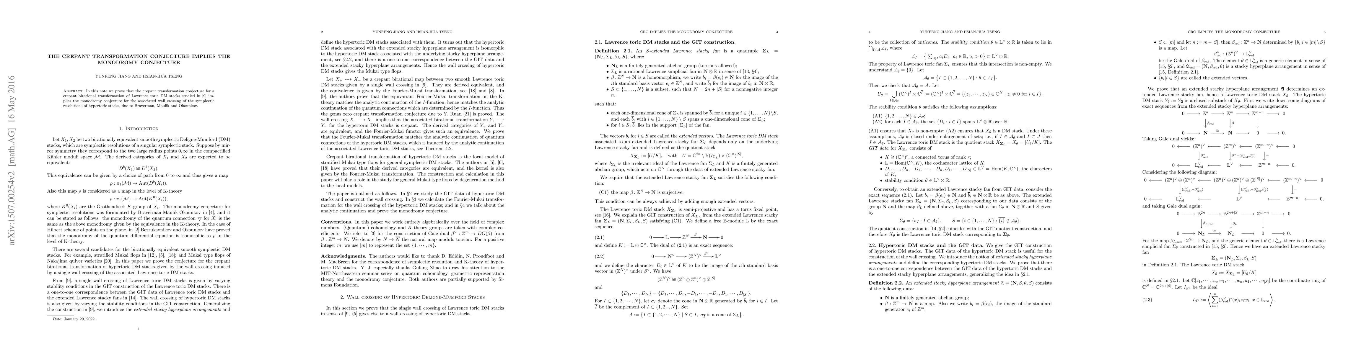 Summary: This paper proves that the crepant transformation conjecture for Lawrence toric DM stacks implies the monodromy conjecture for the associated wall crossing in the symplectic resolutions of hypertoric stacks, linking two significant conjectures in algebraic geometry.