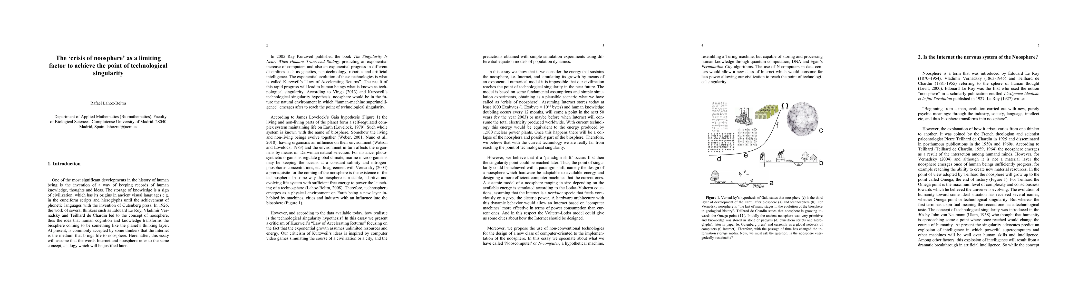 One of the most significant developments in the history of human being is the invention of a way of keeping records of human knowledge, thoughts and ideas. In 1926, the work of several thinkers such as Edouard Le Roy, Vladimir Vernadsky and Teilhard de Chardin led to the concept of noosphere, thus the idea that human cognition and knowledge transforms the biosphere coming to be something like the planet's thinking layer. At present, is commonly accepted by some thinkers that the Internet is the medium that brings life to noosphere. According to Vinge and Kurzweil's technological singularity hypothesis, noosphere would be in the future the natural environment in which 'human-machine superintelligence' emerges after to reach the point of technological singularity. In this paper we show by means of a numerical model the impossibility that our civilization reaches the point of technological singularity in the near future. We propose that this point may be reached when Internet data centers are based on "computer machines" to be more effective in terms of power consumption than current ones. We speculate about what we have called 'Nooscomputer' or N-computer a hypothetical machine which would consume far less power allowing our civilization to reach the point of technological singularity.