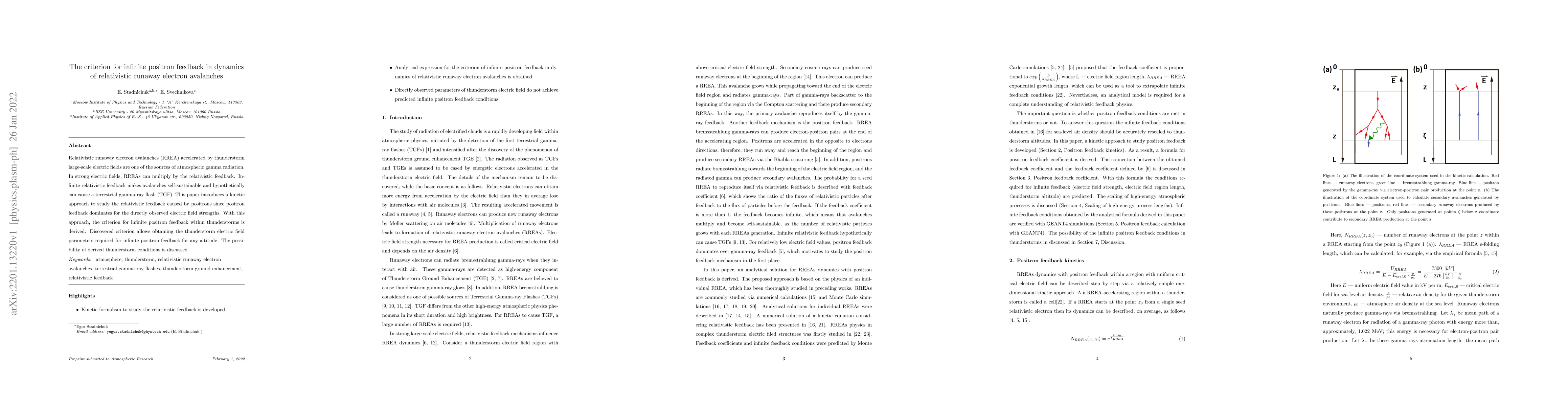 This paper develops a kinetic approach to analyze the relativistic feedback in runaway electron avalanches, focusing on positron feedback, and derives a criterion for infinite positron feedback in thunderstorms. The study finds the electric field parameters needed for this feedback at various altitudes, discussing the feasibility of these conditions.