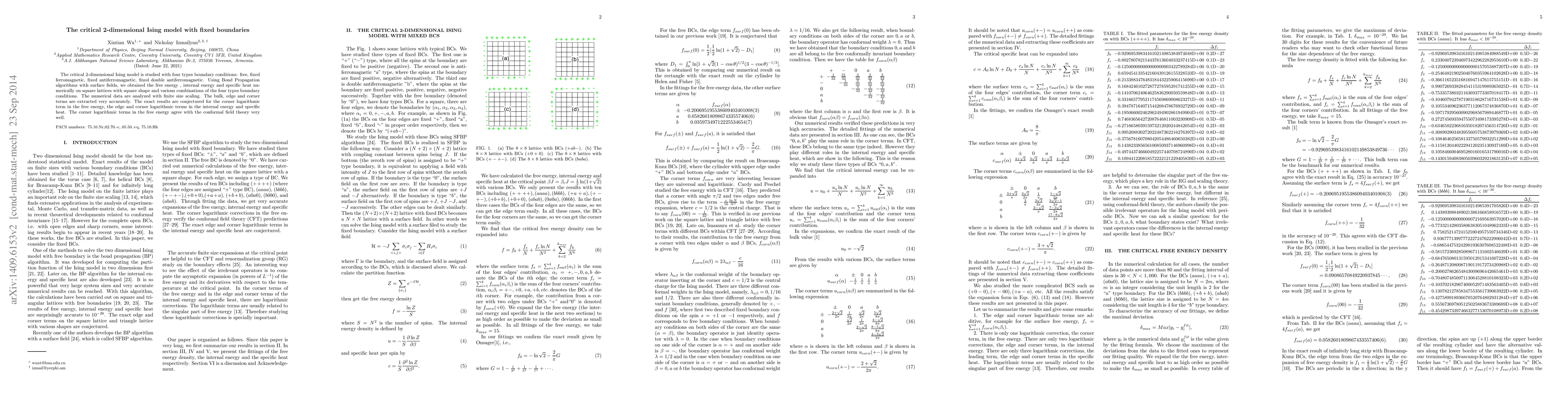 The critical 2-dimensional Ising model is studied with four types boundary conditions: free, fixed ferromagnetic, fixed antiferromagnetic, fixed double antiferromagnetic. Using Bond Propagation algorithms with surface fields, we obtained the free energy, internal energy and specific heat numerically on square lattices with square shape and various combinations of the four types boundary conditions. The numerical data are analyzed with finite size scaling. The bulk, edge and corner terms are extracted very accurately. The exact results are conjectured for the corner logarithmic term in the free energy, the edge and corner logarithmic terms in the internal energy and specific heat. The corner logarithmic terms in the free energy agree with the conformal field theory very well.