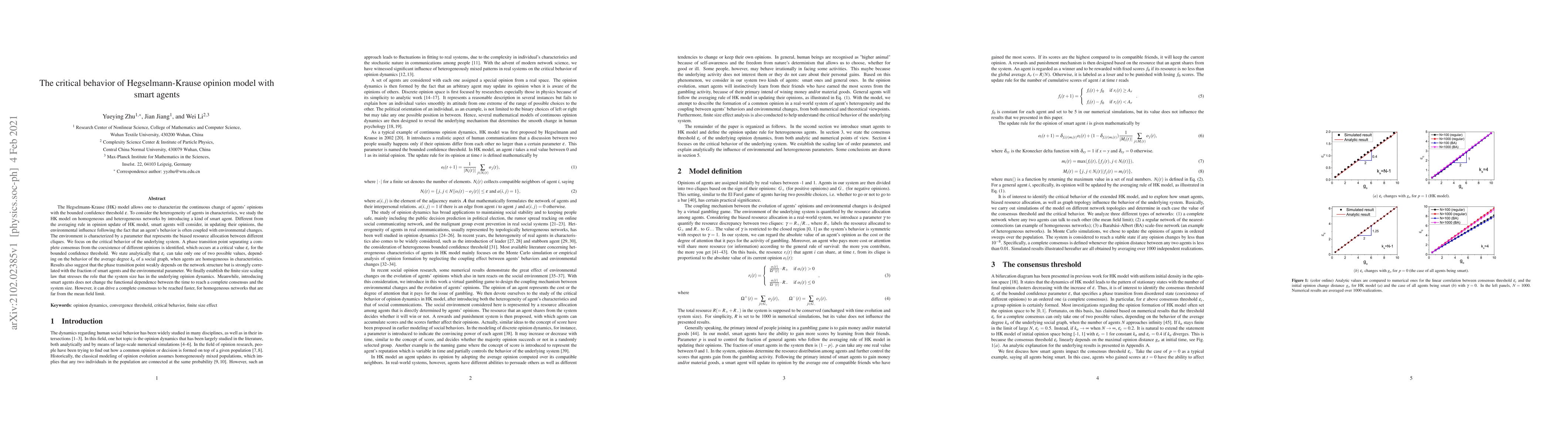 The Hegselmann-Krause (HK) model allows one to characterize the continuous change of agents' opinions with the bounded confidence threshold $\varepsilon$. To consider the heterogeneity of agents in characteristics, we study the HK model on homogeneous and heterogeneous networks by introducing a kind of smart agent. Different from the averaging rule in opinion update of HK model, smart agents will consider, in updating their opinions, the environmental influence following the fact that an agent's behavior is often coupled with environmental changes. The environment is characterized by a parameter that represents the biased resource allocation between different cliques. We focus on the critical behavior of the underlying system. A phase transition point separating a complete consensus from the coexistence of different opinions is identified, which occurs at a critical value $\varepsilon_c$ for the bounded confidence threshold. We state analytically that $\varepsilon_c$ can take only one of two possible values, depending on the behavior of the average degree $k_a$ of a social graph, when agents are homogeneous in characteristics. Results also suggest that the phase transition point weakly depends on the network structure but is strongly correlated with the fraction of smart agents and the environmental parameter. We finally establish the finite size scaling law that stresses the role that the system size has in the underlying opinion dynamics. Meanwhile, introducing smart agents does not change the functional dependence between the time to reach a complete consensus and the system size. However, it can drive a complete consensus to be reached faster, for homogeneous networks that are far from the mean field limit.