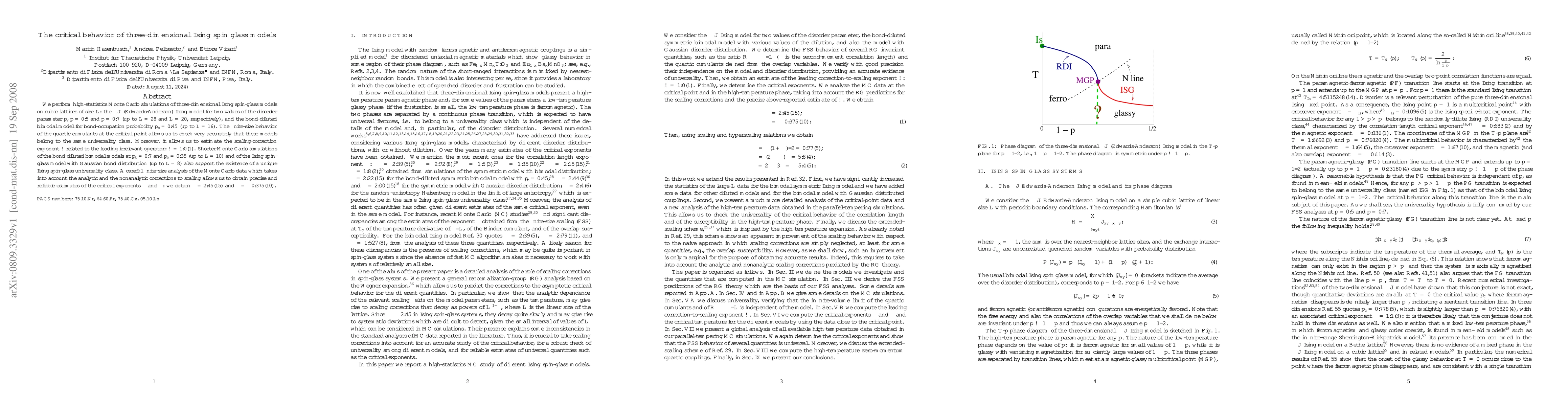 This study uses high-statistics Monte Carlo simulations to investigate the critical behavior of three-dimensional Ising spin glass models, confirming their membership in the same universality class and estimating critical exponents \nu=2.45(15) and \eta=-0.375(10). The analysis also determines the scaling-correction exponent \omega=1.0(1).
