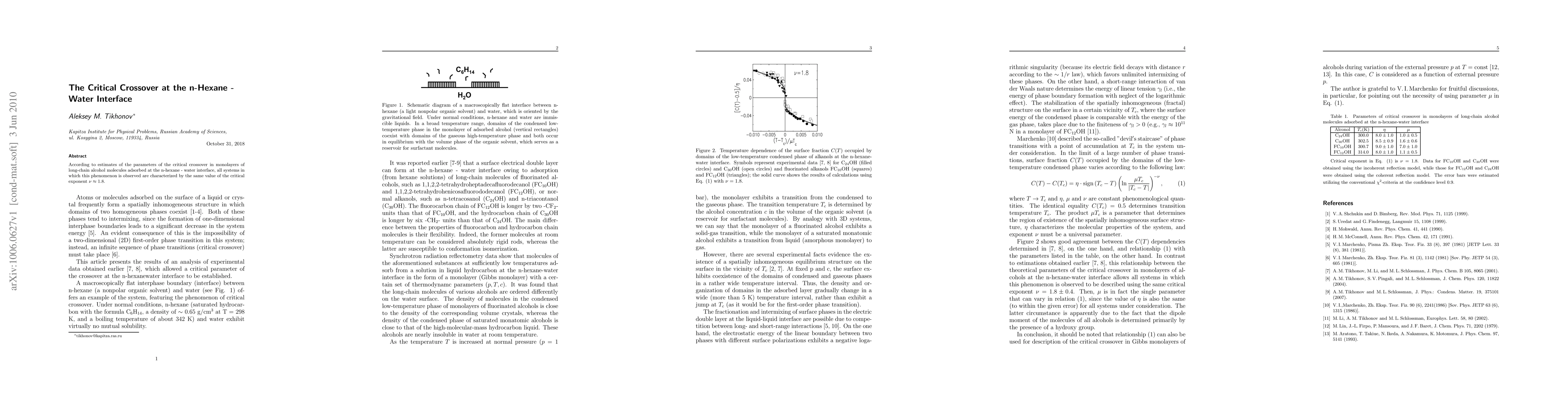 Summary: Research estimates the critical exponent $\nu$ for the critical crossover in monolayers of long-chain alcohols at the n-hexane-water interface, finding a consistent value of approximately 1.8 across all observed systems. This uniformity suggests a universal characteristic of the phenomenon.