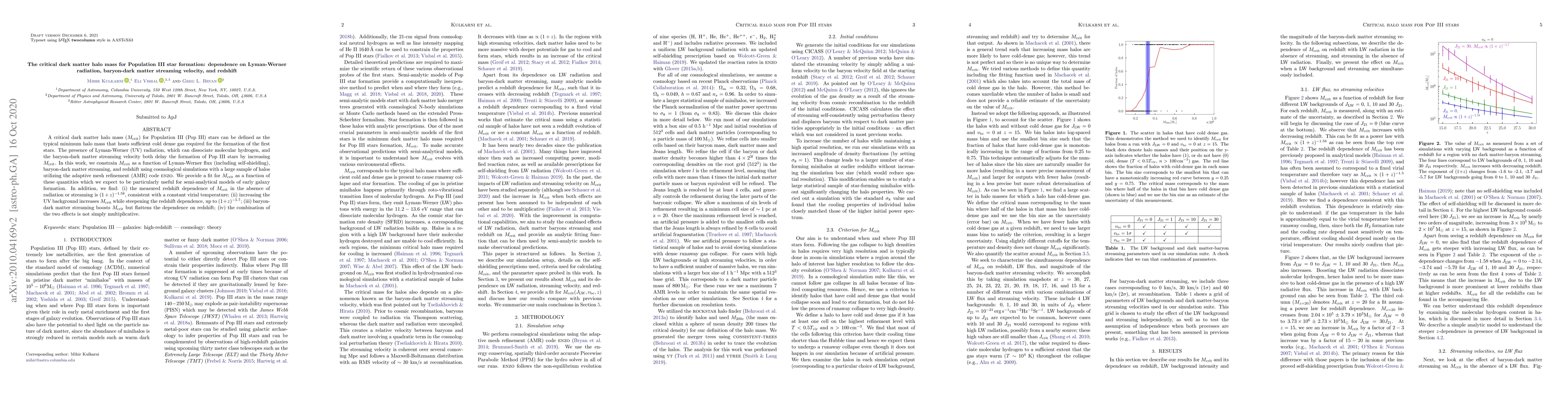 This research defines the critical dark matter halo mass ($M_{\rm crit}$) for Population III star formation, showing how $M_{\rm crit}$ is influenced by Lyman-Werner radiation, baryon-dark matter streaming velocity, and redshift. The study finds that these factors increase $M_{\rm crit}$, delaying star formation, and provides a fit for $M_{\rm crit}$ as a function of these variables, useful for early galaxy formation models.