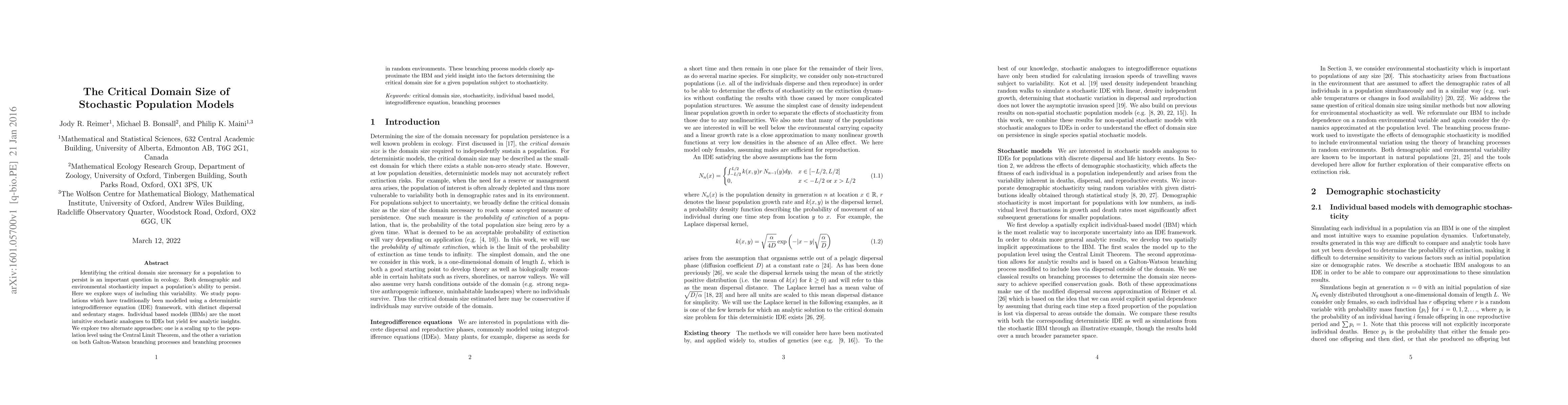 This paper investigates the critical domain size for population persistence under stochastic conditions, employing branching process models to provide insights into the factors influencing this size. It compares traditional deterministic integrodifference equations with stochastic individual-based models and alternative approaches using the Central Limit Theorem.