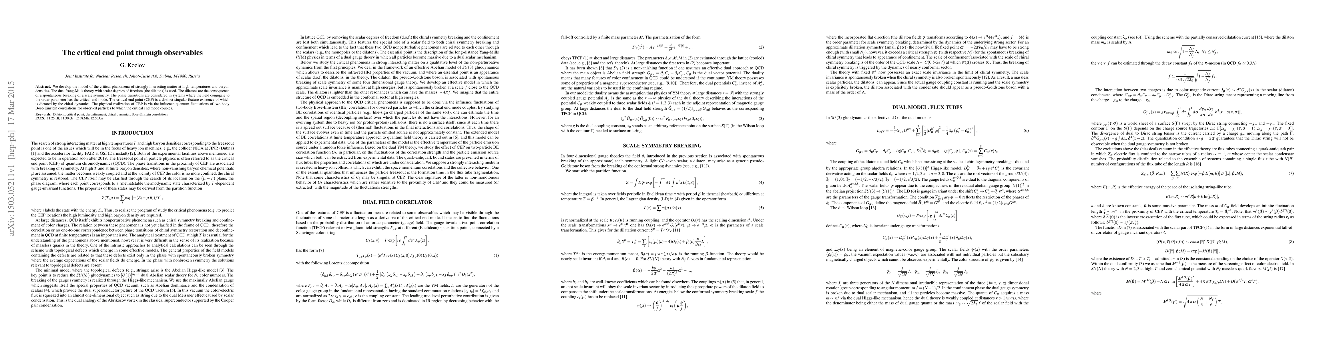 We develop the model of the critical phenomena of strongly interacting matter at high temperatures and baryon densities. The dual Yang-Mills theory with scalar degrees of freedom (the dilatons) is used. The dilatons are the consequence of a spontaneous breaking of a scale symmetry. The phase transitions are considered in systems where the field conjugate to the order parameter has the critical end mode. The critical end point (CEP) is a distinct singular feature existence of which is dictated by the chiral dynamics. The physical realization of CEP is via the influence quantum fluctuations of two-body Bose-Einstein correlations for observed particles to which the critical end mode couples.