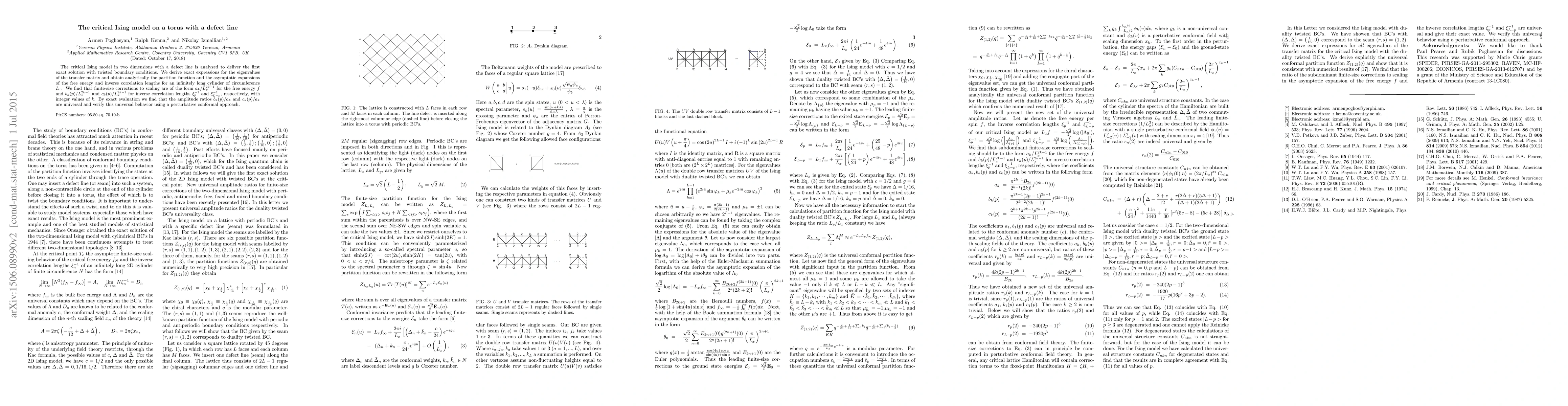 This paper provides the exact solution for the critical Ising model on a toroidal geometry with a defect line, deriving expressions for the partition function and free energy, and demonstrating universal finite-size scaling corrections. The study confirms the universality of amplitude ratios through a perturbative conformal approach.