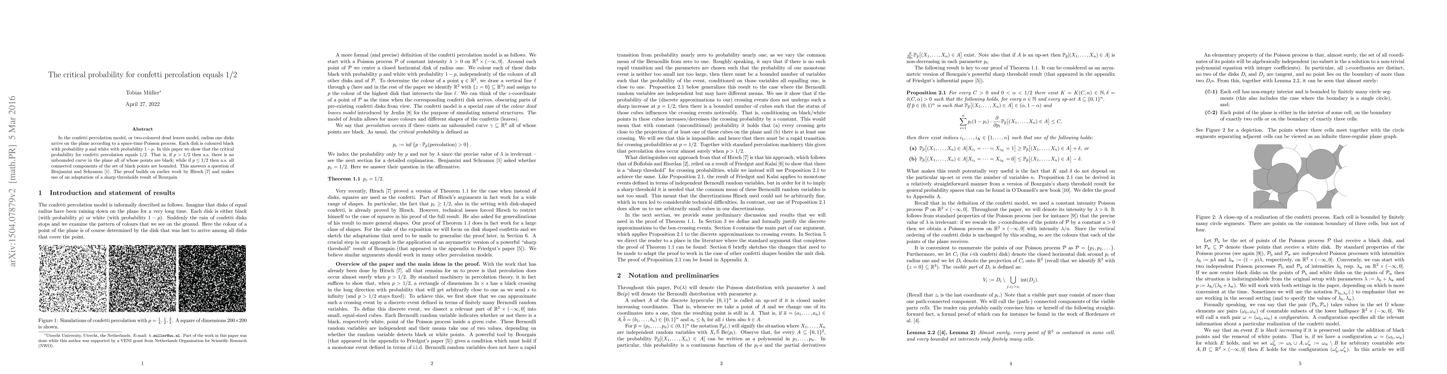 This paper determines that the critical probability for confetti percolation is $p=1/2$. When $p>1/2$, almost surely there exists an unbounded black curve, while for $p \leq 1/2$, all black point clusters are bounded, answering a question posed by Benjamini and Schramm.