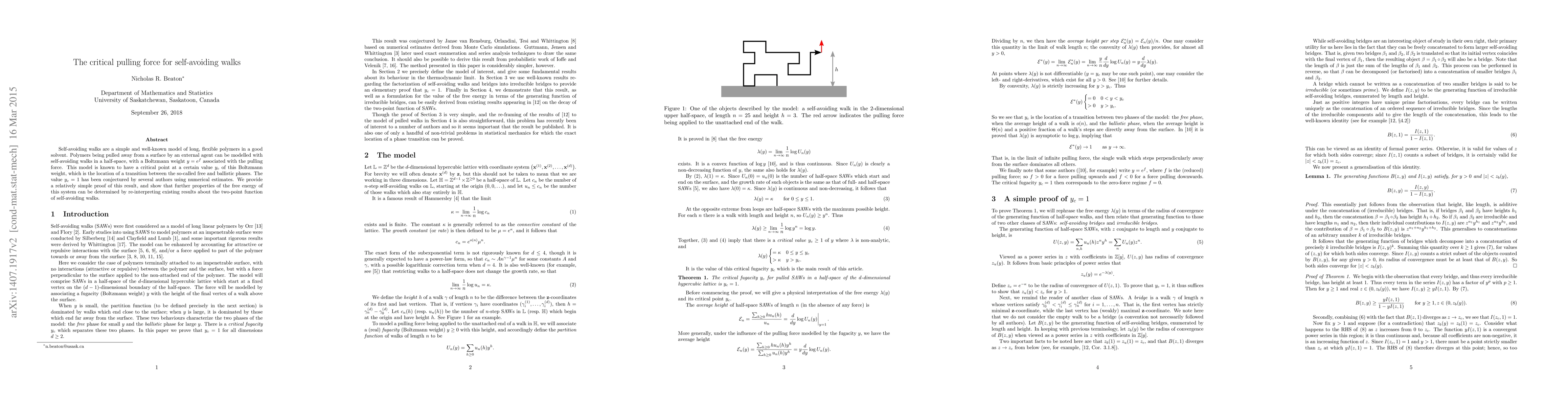 Self-avoiding walks are a simple and well-known model of long, flexible polymers in a good solvent. Polymers being pulled away from a surface by an external agent can be modelled with self-avoiding walks in a half-space, with a Boltzmann weight $y = e^f$ associated with the pulling force. This model is known to have a critical point at a certain value $y_c$ of this Boltzmann weight, which is the location of a transition between the so-called free and ballistic phases. The value $y_c=1$ has been conjectured by several authors using numerical estimates. We provide a relatively simple proof of this result, and show that further properties of the free energy of this system can be determined by re-interpreting existing results about the two-point function of self-avoiding walks.