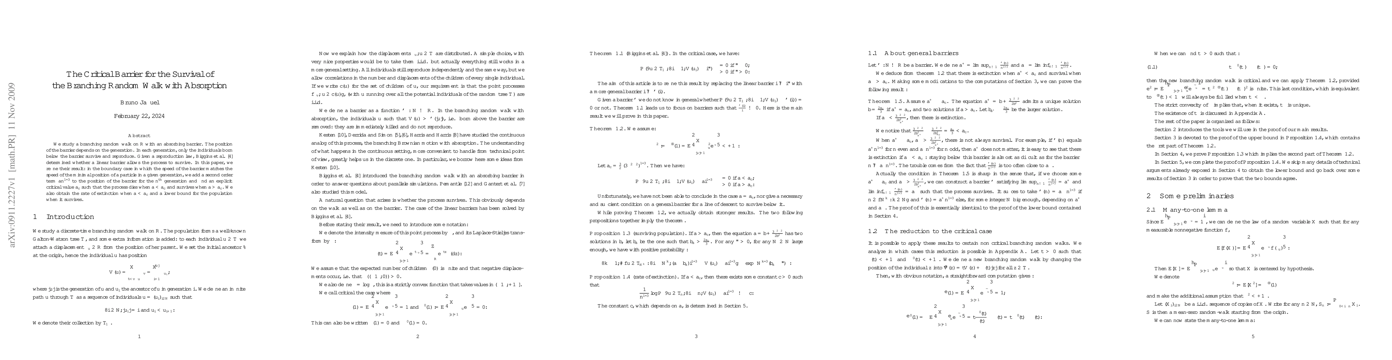 Researchers studied a branching random walk with an absorbing barrier, finding that adding a second-order term to the barrier's position can lead to a critical value beyond which the process dies, and below which it survives, allowing for predictions of extinction rates and population sizes.