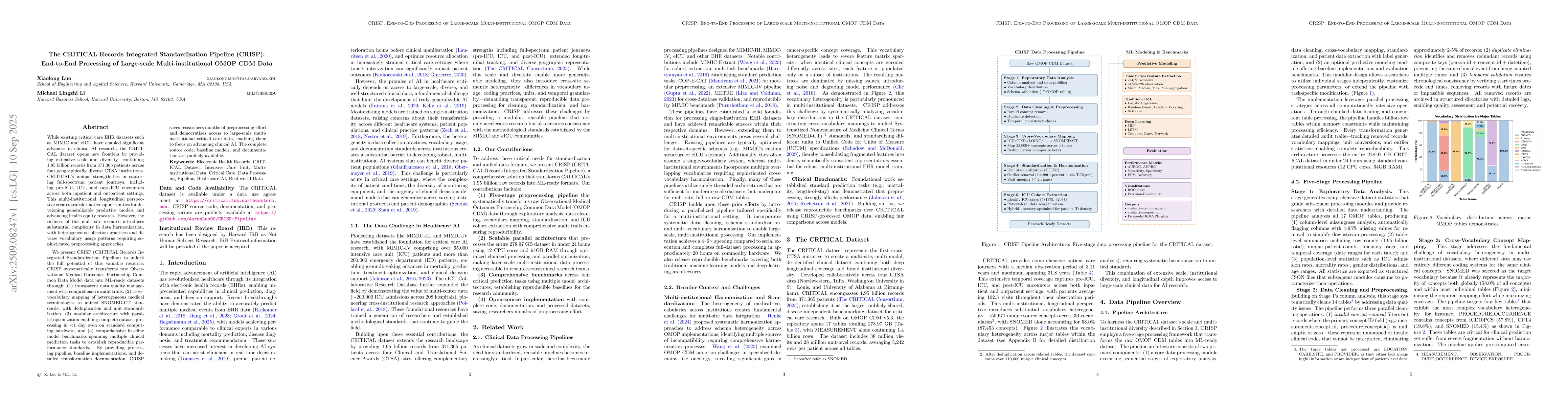 While existing critical care EHR datasets such as MIMIC and eICU have enabled significant advances in clinical AI research, the CRITICAL dataset opens new frontiers by providing extensive scale and diversity -- containing 1.95 billion records from 371,365 patients across four geographically diverse CTSA institutions. CRITICAL's unique strength lies in capturing full-spectrum patient journeys, including pre-ICU, ICU, and post-ICU encounters across both inpatient and outpatient settings. This multi-institutional, longitudinal perspective creates transformative opportunities for developing generalizable predictive models and advancing health equity research. However, the richness of this multi-site resource introduces substantial complexity in data harmonization, with heterogeneous collection practices and diverse vocabulary usage patterns requiring sophisticated preprocessing approaches. We present CRISP to unlock the full potential of this valuable resource. CRISP systematically transforms raw Observational Medical Outcomes Partnership Common Data Model data into ML-ready datasets through: (1) transparent data quality management with comprehensive audit trails, (2) cross-vocabulary mapping of heterogeneous medical terminologies to unified SNOMED-CT standards, with deduplication and unit standardization, (3) modular architecture with parallel optimization enabling complete dataset processing in $<$1 day even on standard computing hardware, and (4) comprehensive baseline model benchmarks spanning multiple clinical prediction tasks to establish reproducible performance standards. By providing processing pipeline, baseline implementations, and detailed transformation documentation, CRISP saves researchers months of preprocessing effort and democratizes access to large-scale multi-institutional critical care data, enabling them to focus on advancing clinical AI.