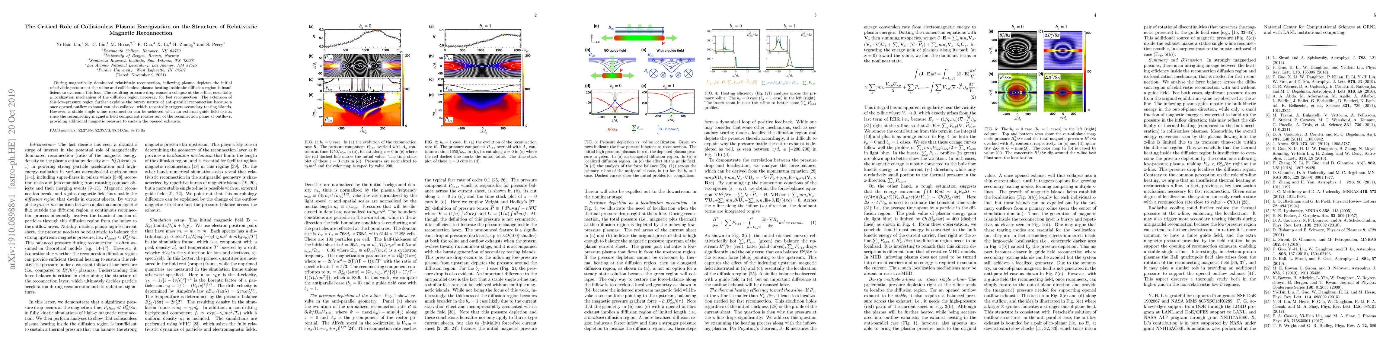 This paper investigates how collisionless plasma energization influences the structure of relativistic magnetic reconnection, showing that insufficient heating leads to x-line collapse and bursty reconnection, while an external guide field stabilizes reconnection by adding magnetic pressure.
