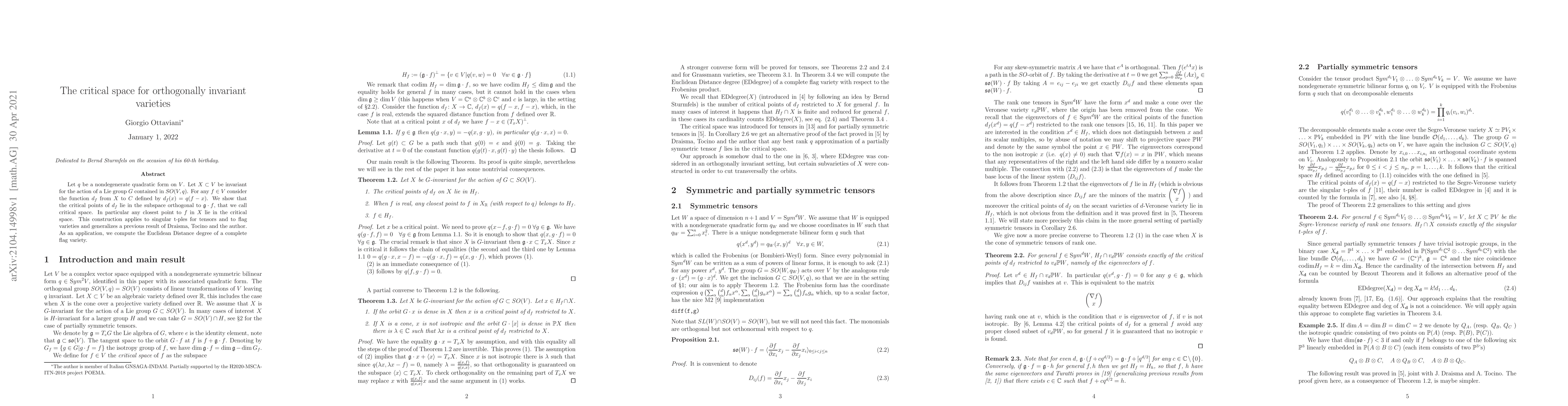 Let $q$ be a nondegenerate quadratic form on $V$. Let $X\subset V$ be invariant for the action of a Lie group $G$ contained in $SO(V,q)$. For any $f\in V$ consider the function $d_f$ from $X$ to $C$ defined by $d_f(x)=q(f-x)$. We show that the critical points of $d_f$ lie in the subspace orthogonal to ${\mathfrak g}\cdot f$, that we call critical space. In particular any closest point to $f$ in $X$ lie in the critical space. This construction applies to singular t-ples for tensors and to flag varieties and generalizes a previous result of Draisma, Tocino and the author. As an application, we compute the Euclidean Distance degree of a complete flag variety.