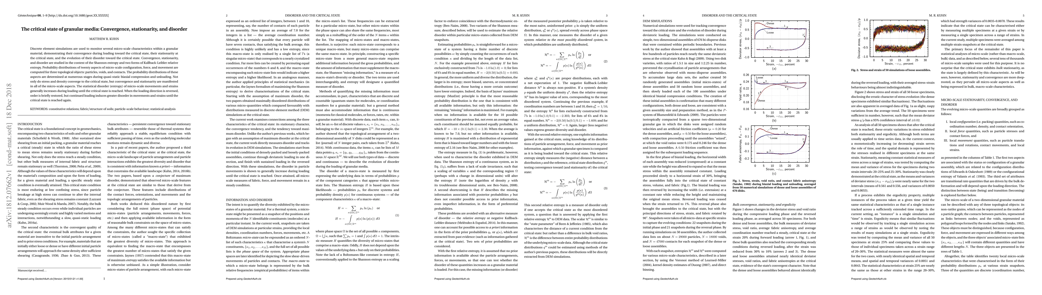 Discrete-element simulations are used to monitor several micro-scale characteristics within a granular material, demonstrating their convergence during loading toward the critical state, their stationarity at the critical state, and the evolution of their disorder toward the critical state. Convergence, stationarity and disorder are studied in the context of the Shannon entropy and two forms of Kullback-Leibler relative entropy. Probability distributions of 20 aspects of micro-scale configuration, force and movement are computed for three topological objects: particles, voids and contacts. The probability distributions of these aspects are determined at numerous stages during quasi-static biaxial compression and unloading. Not only do stress and density converge to the critical state, but convergence and stationarity are manifested in all of the micro-scale aspects. The statistical disorder (entropy) of micro-scale movements and strains generally increases during loading until the critical state is reached. When the loading direction is reversed, order is briefly restored, but continued loading induces greater disorder in movements and strains until the critical state is reached again.