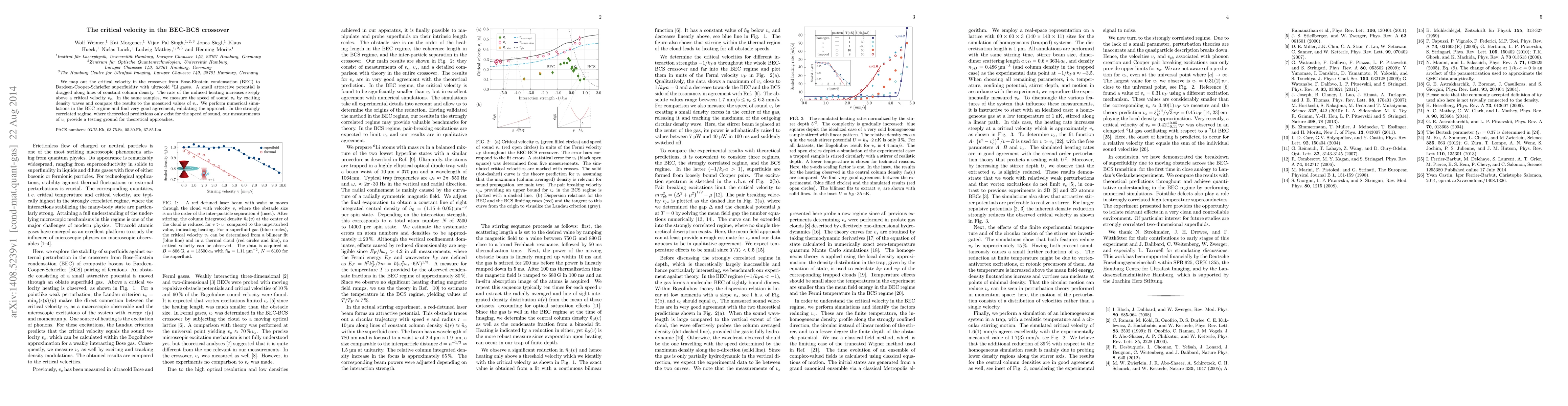We map out the critical velocity in the crossover from Bose-Einstein condensation (BEC) to Bardeen-Cooper-Schrieffer superfluidity with ultracold $^{6}$Li gases. A small attractive potential is dragged along lines of constant column density. The rate of the induced heating increases steeply above a critical velocity $v_c$. In the same samples, we measure the speed of sound $v_s$ by exciting density waves and compare the results to the measured values of $v_c$. We perform numerical simulations in the BEC regime and find very good agreement, validating the approach. In the strongly correlated regime, where theoretical predictions only exist for the speed of sound, our measurements of $v_c$ provide a testing ground for theoretical approaches.