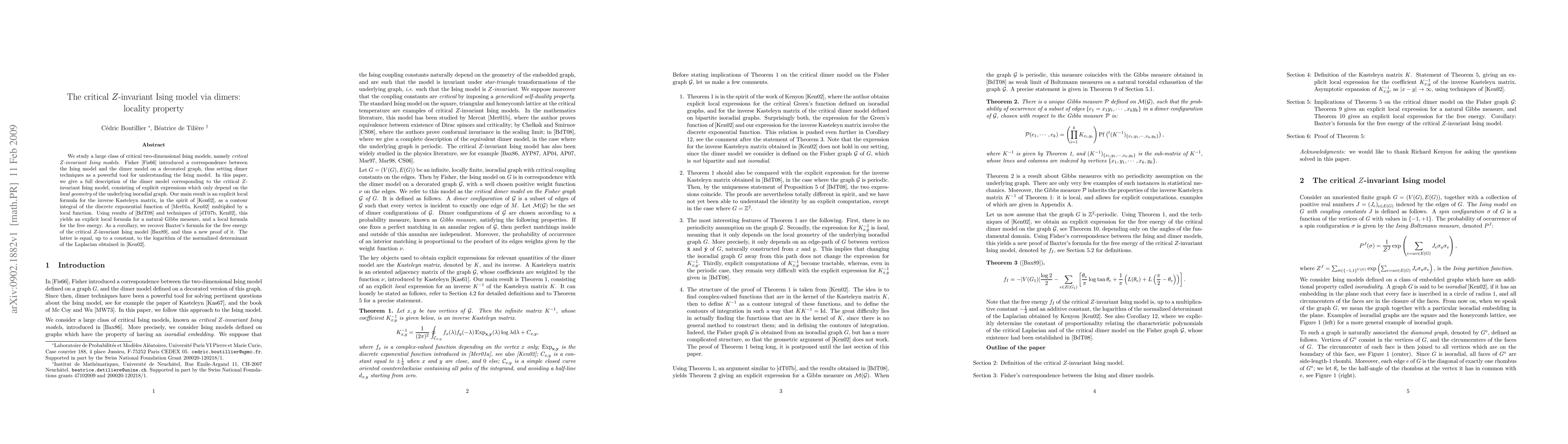 This paper explores the critical Z-invariant Ising models through dimer models on decorated graphs, providing explicit local expressions for the inverse Kasteleyn matrix and Gibbs measure. It also derives a local formula for the free energy, leading to a new proof of Baxter's formula for the free energy of these models.