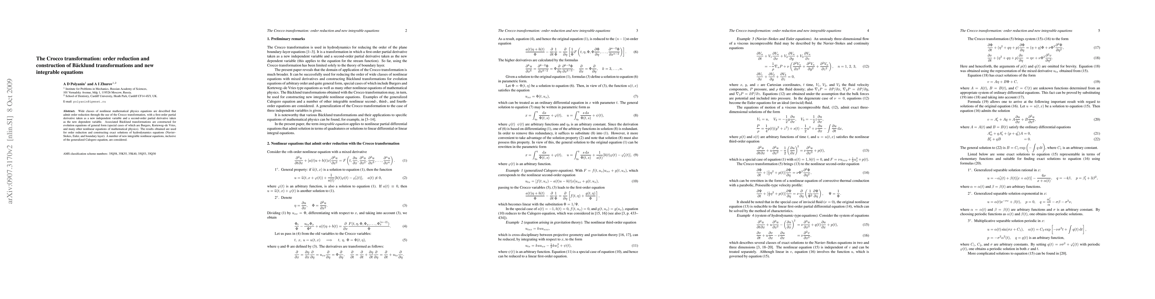 Wide classes of nonlinear mathematical physics equations are described that admit order reduction through the use of the Crocco transformation, with a first-order partial derivative taken as a new independent variable and a second-order partial derivative taken as the new dependent variable. Associated Backlund transformations are constructed for evolution equations of general form (special cases of which are Burgers, Korteweg-de Vries, and many other nonlinear equations of mathematical physics). The results obtained are used for order reduction and constructing exact solutions of hydrodynamics equations (Navier-Stokes, Euler, and boundary layer). A number of new integrable nonlinear equations, inclusive of the generalized Calogero equation, are considered.