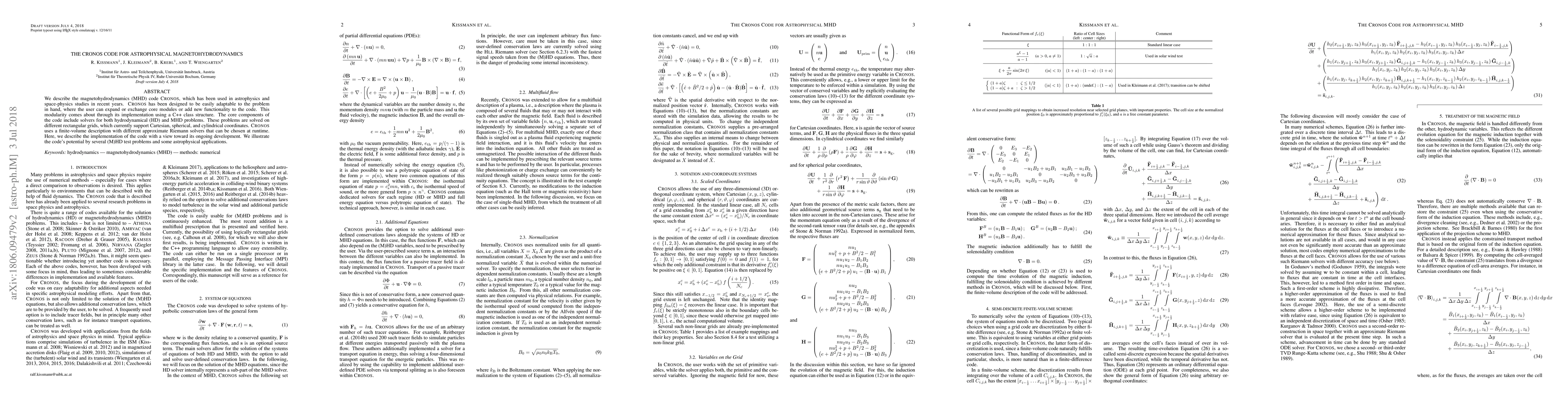 The CRONOS code is a flexible, C++-based magnetohydrodynamics (MHD) simulation tool adaptable to various astrophysical problems through modular design. It employs finite-volume methods and supports Cartesian, spherical, and cylindrical grids, with ongoing development and applications in astrophysics.
