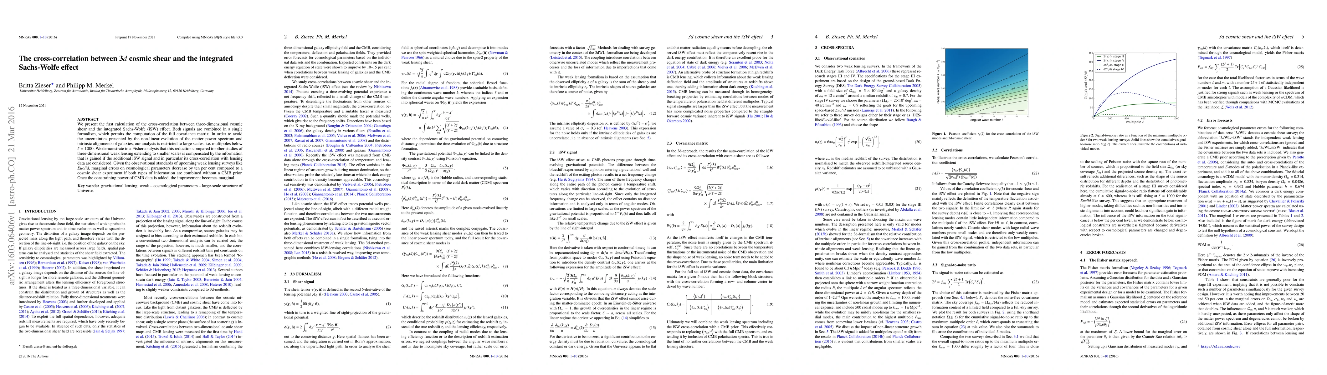 We present the first calculation of the cross-correlation between three-dimensional cosmic shear and the integrated Sachs-Wolfe (iSW) effect. Both signals are combined in a single formalism, which permits the computation of the full covariance matrix. In order to avoid the uncertainties presented by the non-linear evolution of the matter power spectrum and intrinsic alignments of galaxies, our analysis is restricted to large scales, i.e. multipoles below l=1000. We demonstrate in a Fisher analysis that this reduction compared to other studies of three-dimensional weak lensing extending to smaller scales is compensated by the information that is gained if the additional iSW signal and in particular its cross-correlation with lensing data are considered. Given the observational standards of upcoming weak lensing surveys like Euclid, marginal errors on cosmological parameters decrease by ten per cent compared to a cosmic shear experiment if both types of information are combined without a CMB prior. Once the constraining power of CMB data is added, the improvement becomes marginal.