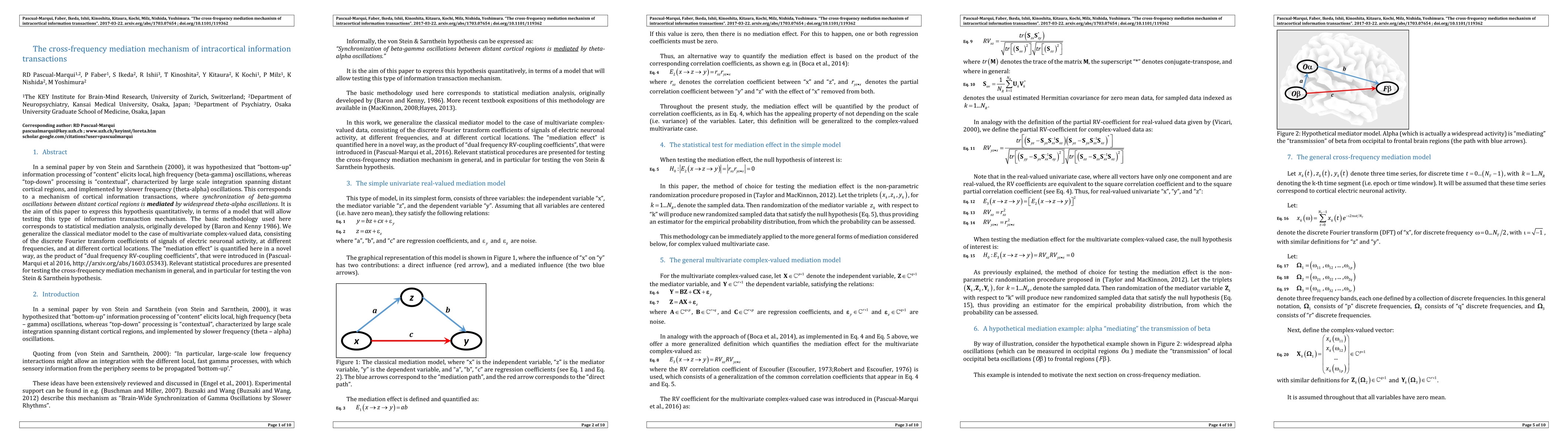 In a seminal paper by von Stein and Sarnthein (2000), it was hypothesized that "bottom-up" information processing of "content" elicits local, high frequency (beta-gamma) oscillations, whereas "top-down" processing is "contextual", characterized by large scale integration spanning distant cortical regions, and implemented by slower frequency (theta-alpha) oscillations. This corresponds to a mechanism of cortical information transactions, where synchronization of beta-gamma oscillations between distant cortical regions is mediated by widespread theta-alpha oscillations. It is the aim of this paper to express this hypothesis quantitatively, in terms of a model that will allow testing this type of information transaction mechanism. The basic methodology used here corresponds to statistical mediation analysis, originally developed by (Baron and Kenny 1986). We generalize the classical mediator model to the case of multivariate complex-valued data, consisting of the discrete Fourier transform coefficients of signals of electric neuronal activity, at different frequencies, and at different cortical locations. The "mediation effect" is quantified here in a novel way, as the product of "dual frequency RV-coupling coefficients", that were introduced in (Pascual-Marqui et al 2016, http://arxiv.org/abs/1603.05343). Relevant statistical procedures are presented for testing the cross-frequency mediation mechanism in general, and in particular for testing the von Stein & Sarnthein hypothesis.