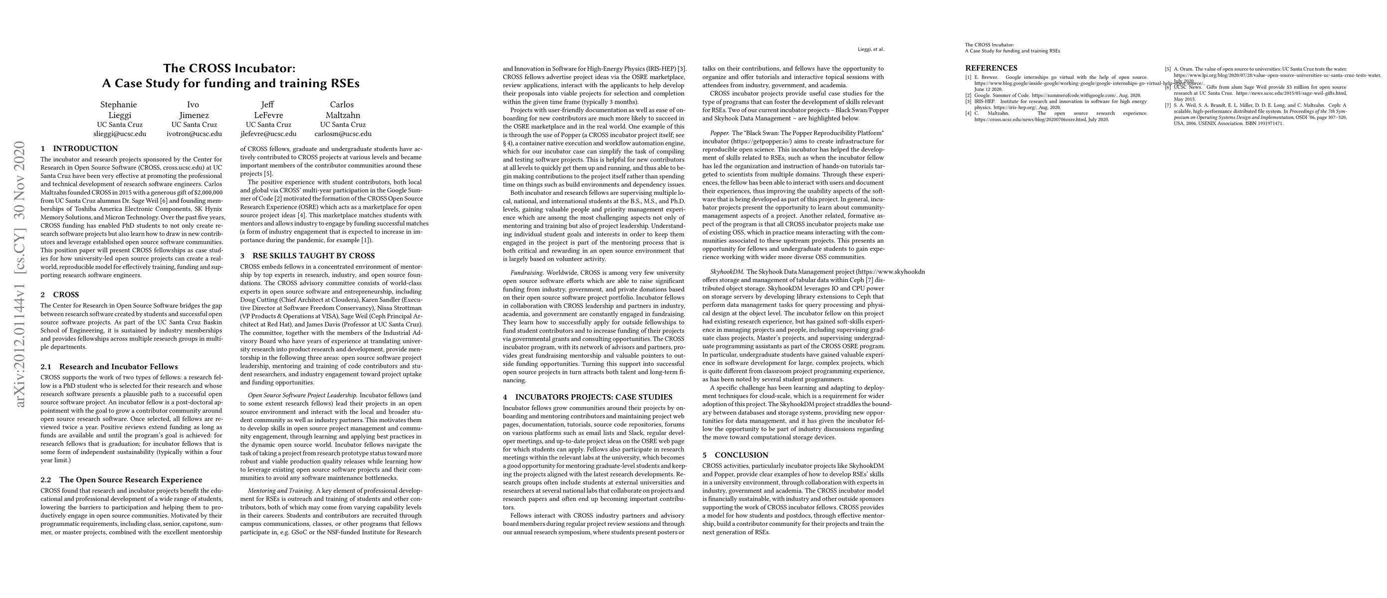 The incubator and research projects sponsored by the Center for Research in Open Source Software (CROSS, cross.ucsc.edu) at UC Santa Cruz have been very effective at promoting the professional and technical development of research software engineers. Carlos Maltzahn founded CROSS in 2015 with a generous gift of $2,000,000 from UC Santa Cruz alumnus Dr. Sage Weil and founding memberships of Toshiba America Electronic Components, SK Hynix Memory Solutions, and Micron Technology. Over the past five years, CROSS funding has enabled PhD students to not only create research software projects but also learn how to draw in new contributors and leverage established open source software communities. This position paper will present CROSS fellowships as case studies for how university-led open source projects can create a real-world, reproducible model for effectively training, funding and supporting research software engineers.