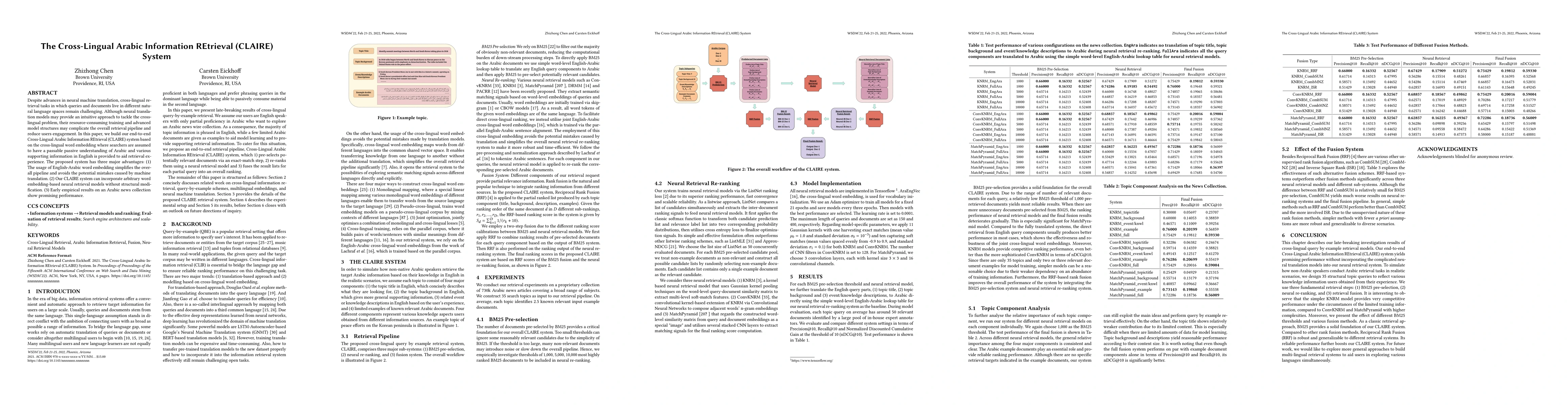 The CLAIRE system simplifies cross-lingual Arabic-English information retrieval using English-Arabic word embeddings, avoiding translation errors and enhancing user engagement. Early results indicate promising performance in retrieving Arabic news documents.