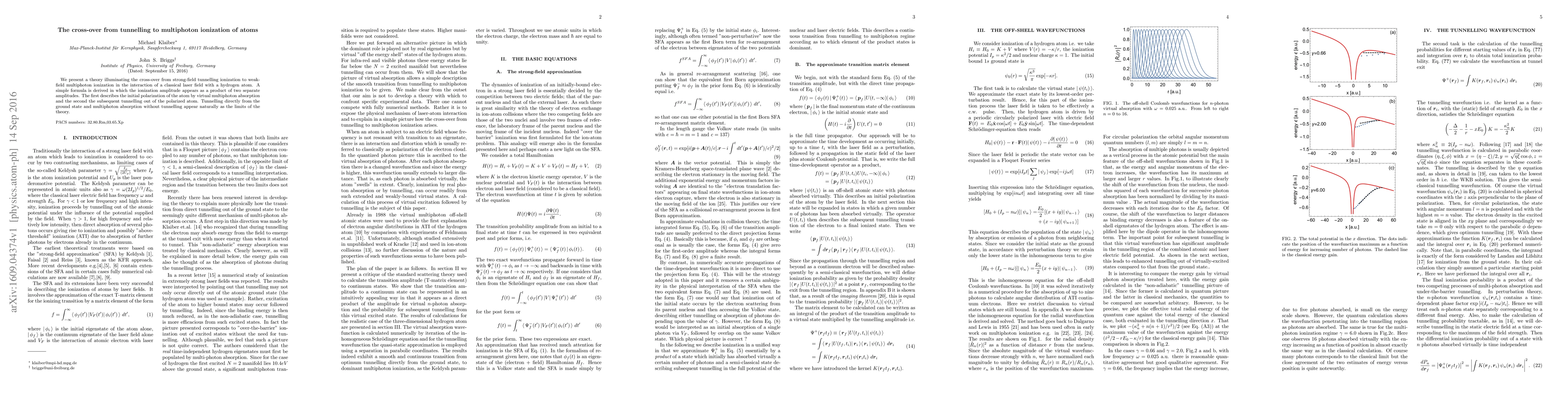 The paper presents a theory describing the transition from strong-field tunnelling ionization to weak-field multiphoton ionization in laser-atom interactions, using a simple formula that separates the ionization amplitude into two distinct amplitudes: initial polarization via virtual multiphoton absorption and subsequent tunnelling from the polarized atom.