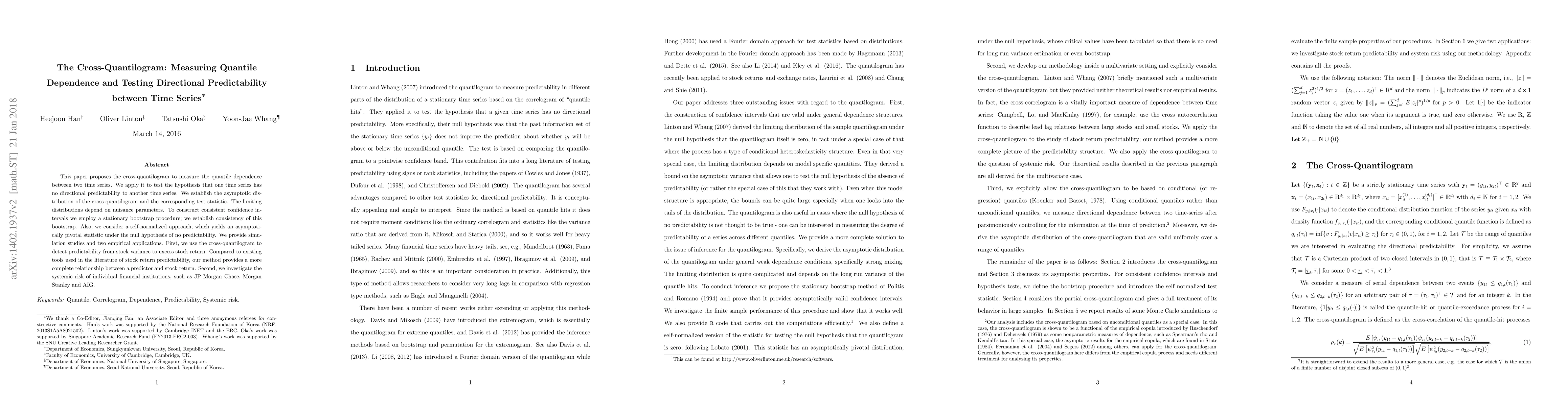This paper introduces the cross-quantilogram to measure quantile dependence between time series and tests directional predictability. It provides a robust statistical framework with consistent confidence intervals and simulation studies, demonstrating its application in stock market predictability and systemic risk analysis.