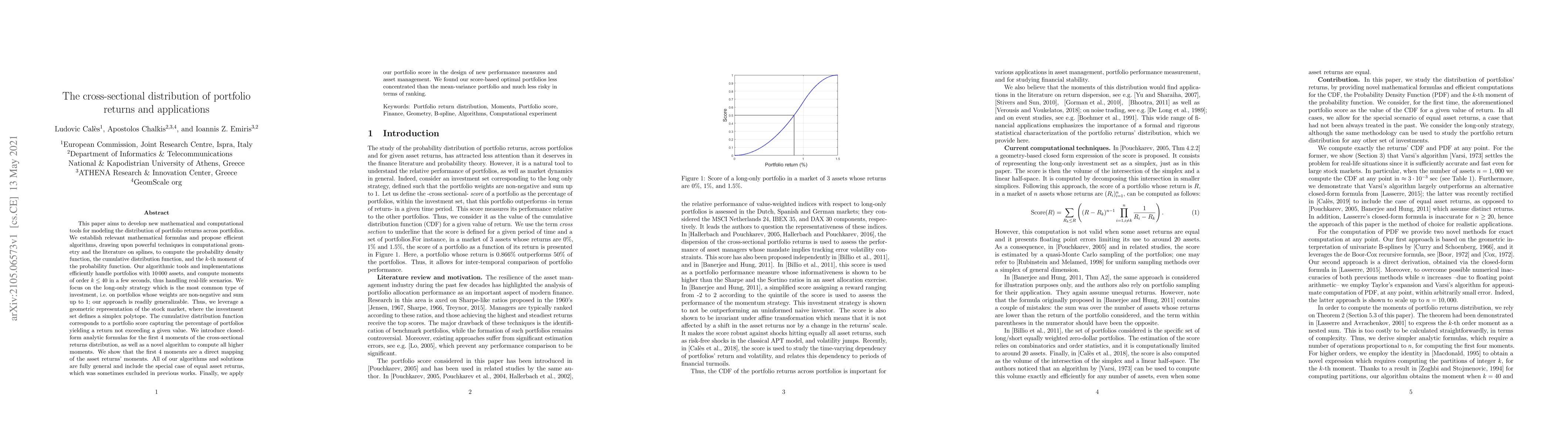 This paper aims to develop new mathematical and computational tools for modeling the distribution of portfolio returns across portfolios. We establish relevant mathematical formulas and propose efficient algorithms, drawing upon powerful techniques in computational geometry and the literature on splines, to compute the probability density function, the cumulative distribution function, and the k-th moment of the probability function. Our algorithmic tools and implementations efficiently handle portfolios with 10000 assets, and compute moments of order k up to 40 in a few seconds, thus handling real-life scenarios. We focus on the long-only strategy which is the most common type of investment, i.e. on portfolios whose weights are non-negative and sum up to 1; our approach is readily generalizable. Thus, we leverage a geometric representation of the stock market, where the investment set defines a simplex polytope. The cumulative distribution function corresponds to a portfolio score capturing the percentage of portfolios yielding a return not exceeding a given value. We introduce closed-form analytic formulas for the first 4 moments of the cross-sectional returns distribution, as well as a novel algorithm to compute all higher moments. We show that the first 4 moments are a direct mapping of the asset returns' moments. All of our algorithms and solutions are fully general and include the special case of equal asset returns, which was sometimes excluded in previous works. Finally, we apply our portfolio score in the design of new performance measures and asset management. We found our score-based optimal portfolios less concentrated than the mean-variance portfolio and much less risky in terms of ranking.