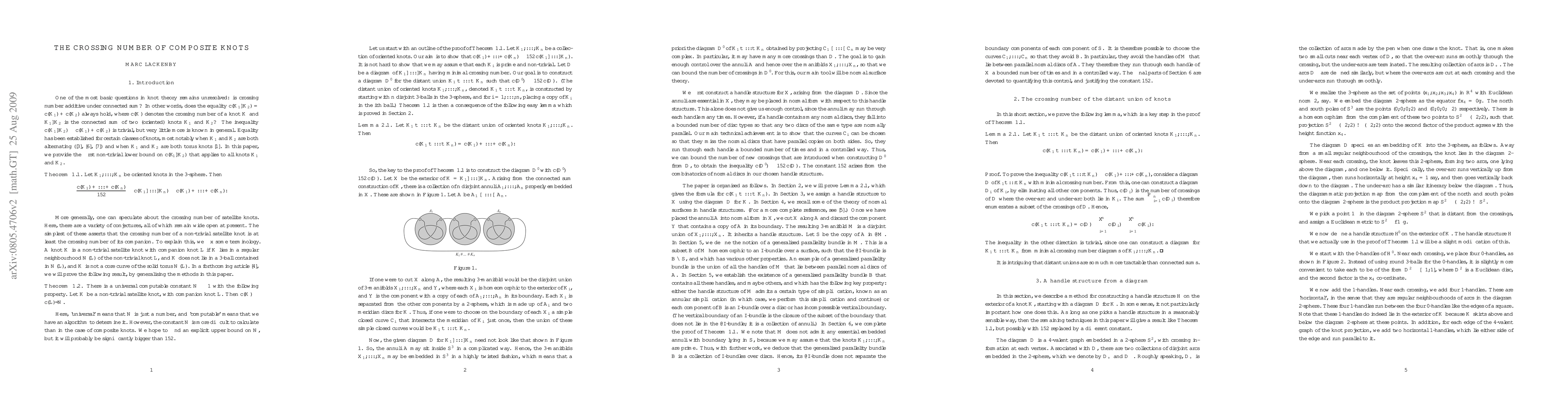 Title: The crossing number of composite knots Summary: The paper proves that the crossing number of the connected sum of two knots is at most the sum of their individual crossing numbers, and at least one-hundred-fifty-two times that sum.