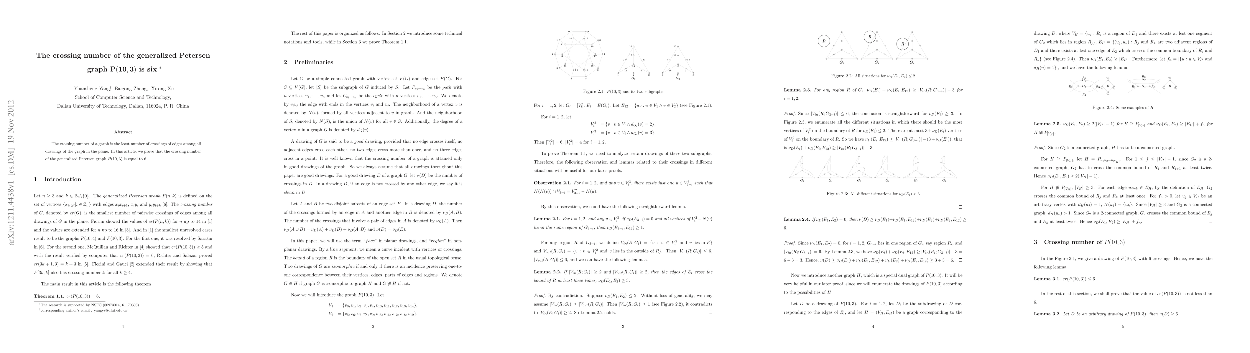 Summary: This paper proves that the crossing number of the generalized Petersen graph P(10, 3) is 6, meaning the minimum number of edge crossings in any planar drawing of this graph is six. The authors provide a detailed proof to establish this result.