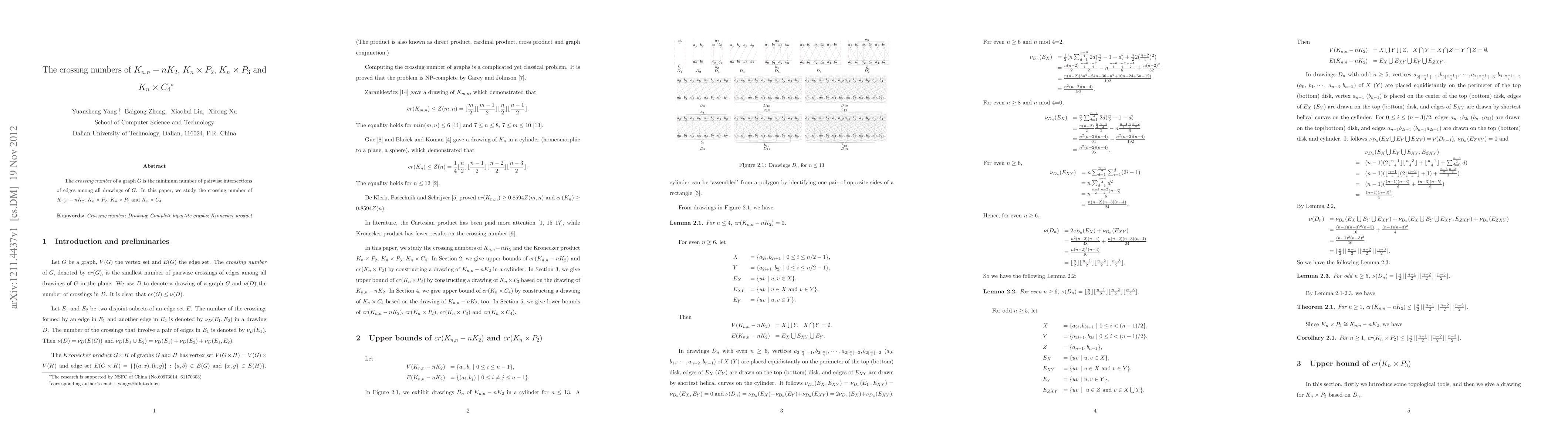This paper investigates the minimum number of edge intersections in various graph drawings, specifically for $K_{n,n}-nK_2$, $K_{n}\times P_2$, $K_{n}\times P_3$, and $K_{n}\times C_4$, defining the crossing number for each.