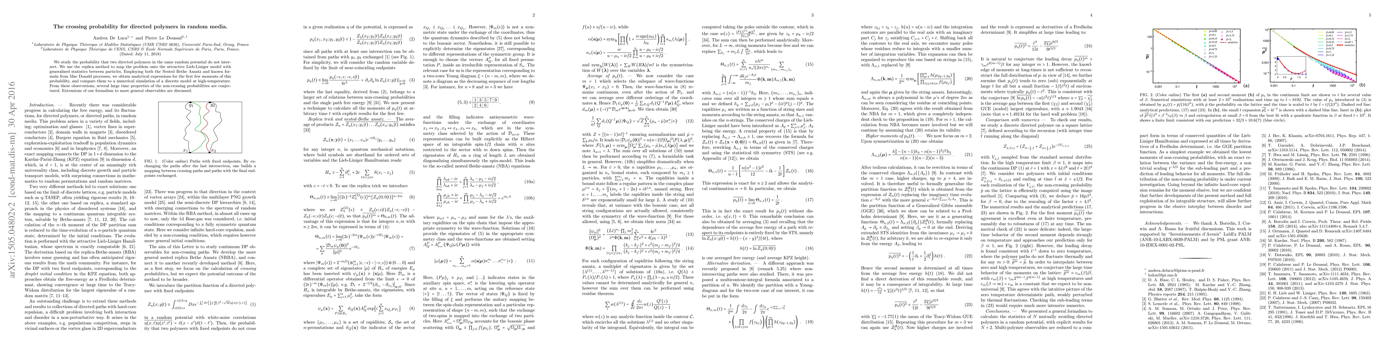 We study the probability that two directed polymers in the same random potential do not intersect. We use the replica method to map the problem onto the attractive Lieb-Liniger model with generalized statistics between particles. We obtain analytical expressions for the first few moments of this probability, and compare them to a numerical simulation of a discrete model at high-temperature. From these observations, several large time properties of the non-crossing probabilities are conjectured. Extensions of our formalism to more general observables are discussed.