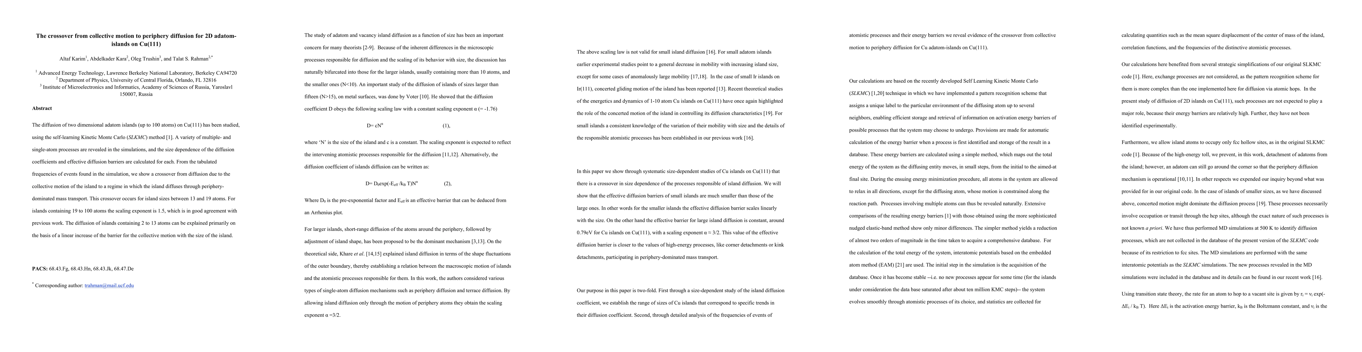 The diffusion of two dimensional adatom islands (up to 100 atoms) on Cu(111) has been studied, using the self-learning Kinetic Monte Carlo (SLKMC) method [1]. A variety of multiple- and single-atom processes are revealed in the simulations, and the size dependence of the diffusion coefficients and effective diffusion barriers are calculated for each. From the tabulated frequencies of events found in the simulation, we show a crossover from diffusion due to the collective motion of the island to a regime in which the island diffuses through periphery-dominated mass transport. This crossover occurs for island sizes between 13 and 19 atoms. For islands containing 19 to 100 atoms the scaling exponent is 1.5, which is in good agreement with previous work. The diffusion of islands containing 2 to 13 atoms can be explained primarily on the basis of a linear increase of the barrier for the collective motion with the size of the island.