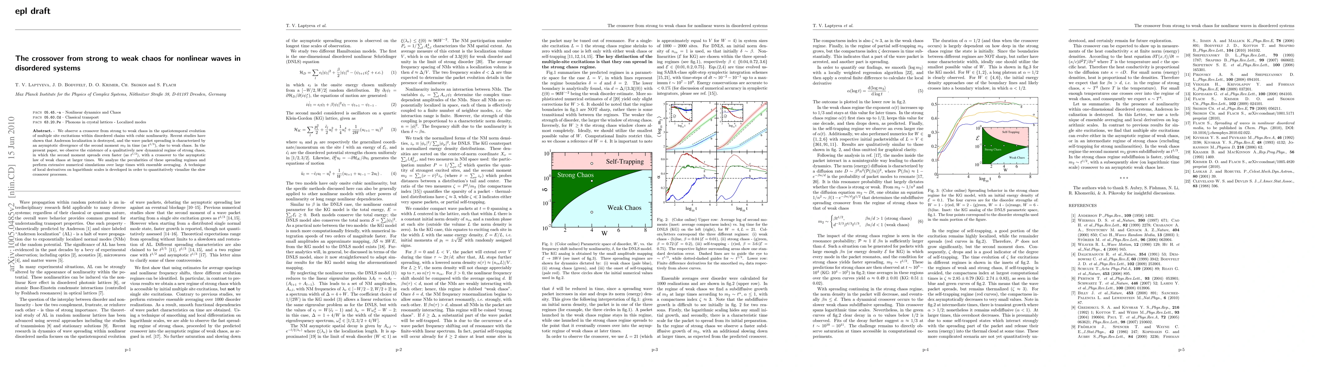 This paper investigates the transition from strong to weak chaos in nonlinear waves within disordered chains, observing a faster spreading of wave packets in strong chaos (as $t^{1/2}$) compared to weak chaos (as $t^{1/3}$). It develops a technique to visualize the crossover and performs extensive numerical simulations to analyze these dynamical regimes.