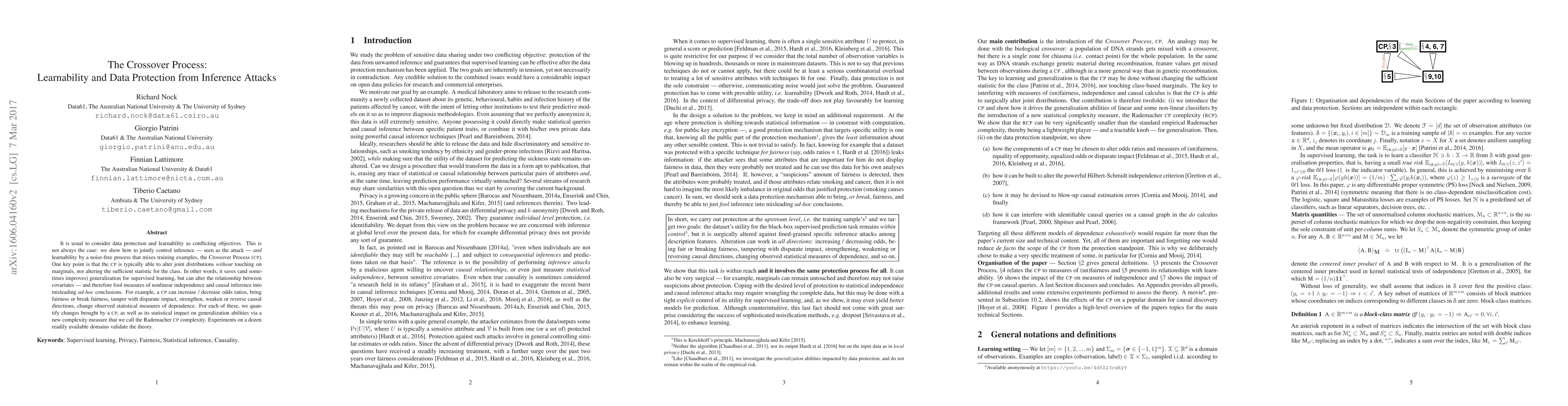 It is usual to consider data protection and learnability as conflicting objectives. This is not always the case: we show how to jointly control inference --- seen as the attack --- and learnability by a noise-free process that mixes training examples, the Crossover Process (cp). One key point is that the cp~is typically able to alter joint distributions without touching on marginals, nor altering the sufficient statistic for the class. In other words, it saves (and sometimes improves) generalization for supervised learning, but can alter the relationship between covariates --- and therefore fool measures of nonlinear independence and causal inference into misleading ad-hoc conclusions. For example, a cp~can increase / decrease odds ratios, bring fairness or break fairness, tamper with disparate impact, strengthen, weaken or reverse causal directions, change observed statistical measures of dependence. For each of these, we quantify changes brought by a cp, as well as its statistical impact on generalization abilities via a new complexity measure that we call the Rademacher cp~complexity. Experiments on a dozen readily available domains validate the theory.
