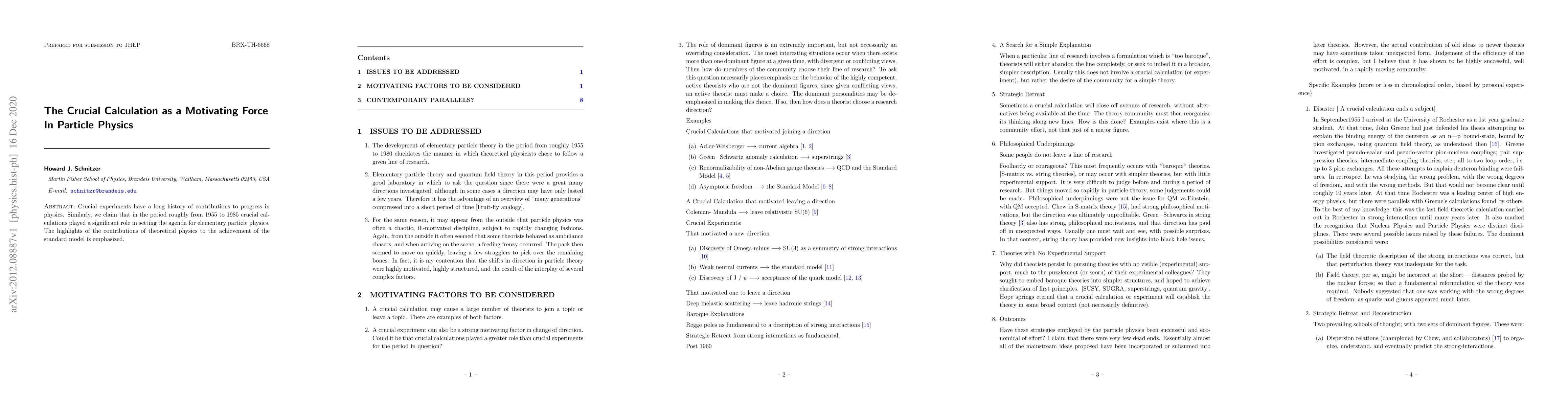 Crucial experiments have a long history of contributions to progress in physics. Similarly, we claim that in the period roughly from 1955 to 1985 crucial calculations played a significant role in setting the agenda for elementary particle physics. The highlights of the contributions of theoretical physics to the achievement of the standard model is emphasized