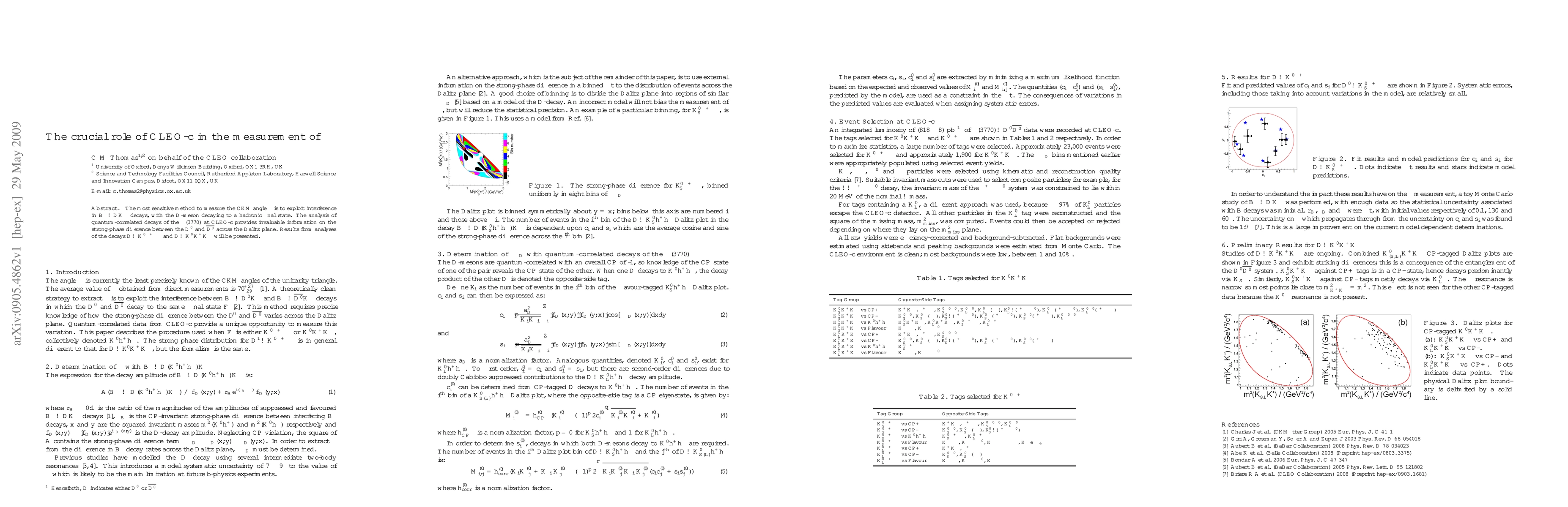 The CLEO-c experiment measures the CKM angle gamma through interference in B(+/-)->DK(+/-) decays, using quantum-correlated decays of psi(3770) to analyze the strong-phase difference in D0 and D0bar across the Dalitz plane. Results from D->K0PiPi and D->K0KK decay analyses provide crucial data.