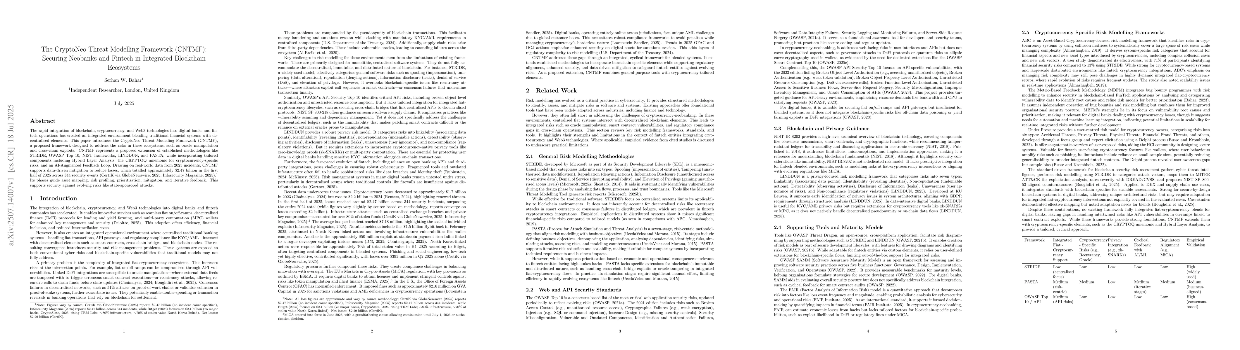 The rapid integration of blockchain, cryptocurrency, and Web3 technologies into digital banks and fintech operations has created an integrated environment blending traditional financial systems with decentralised elements. This paper introduces the CryptoNeo Threat Modelling Framework (CNTMF), a proposed framework designed to address the risks in these ecosystems, such as oracle manipulation and cross-chain exploits. CNTMF represents a proposed extension of established methodologies like STRIDE, OWASP Top 10, NIST frameworks, LINDDUN, and PASTA, while incorporating tailored components including Hybrid Layer Analysis, the CRYPTOQ mnemonic for cryptocurrency-specific risks, and an AI-Augmented Feedback Loop. Drawing on real-world data from 2025 incidents, CNTMF supports data-driven mitigation to reduce losses, which totalled approximately $2.47 billion in the first half of 2025 across 344 security events (CertiK via GlobeNewswire, 2025; Infosecurity Magazine, 2025). Its phases guide asset mapping, risk profiling, prioritisation, mitigation, and iterative feedback. This supports security against evolving risks like state-sponsored attacks.