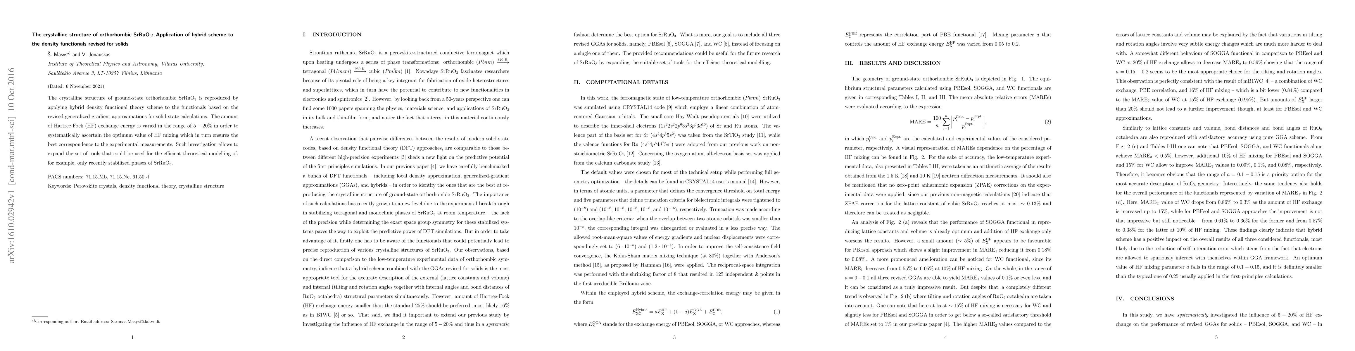 The crystalline structure of ground-state orthorhombic SrRuO$_3$ is reproduced by applying hybrid density functional theory scheme to the functionals based on the revised generalized-gradient approximations for solid-state calculations. The amount of Hartree-Fock (HF) exchange energy is varied in the range of $5-20\%$ in order to systematically ascertain the optimum value of HF mixing which in turn ensures the best correspondence to the experimental measurements. Such investigation allows to expand the set of tools that could be used for the efficient theoretical modelling of, for example, only recently stabilized phases of SrRuO$_3$.