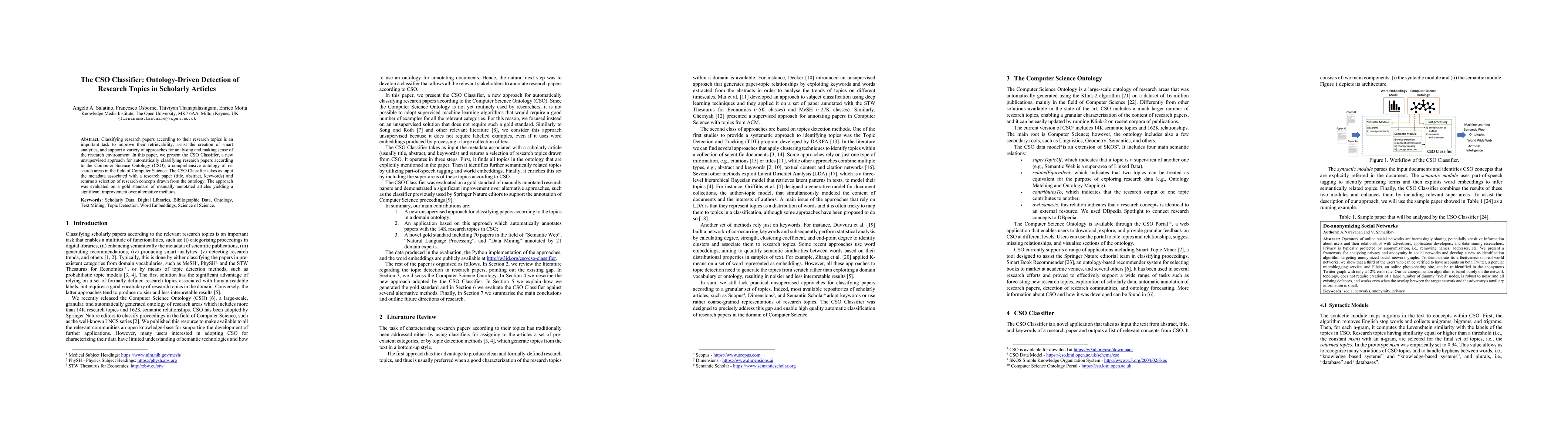 The CSO Classifier is an unsupervised method that uses the Computer Science Ontology (CSO) to automatically categorize research papers based on their metadata. Evaluation against manually annotated articles showed significant improvement over existing methods.