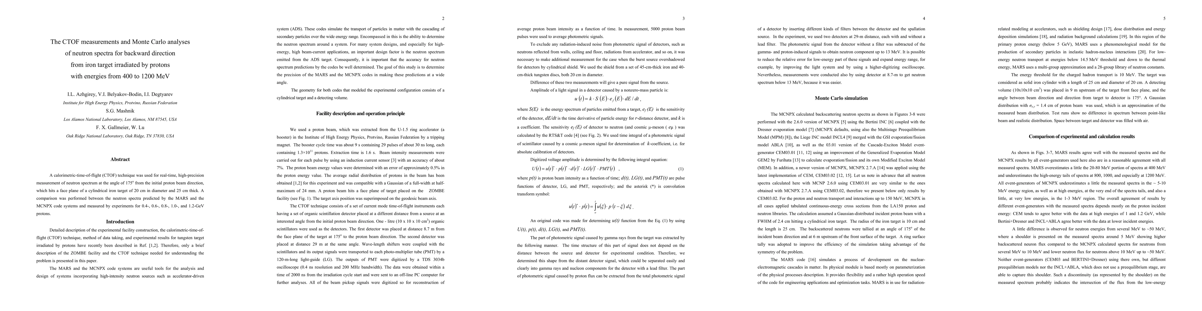 A calorimetric-time-of-flight (CTOF) technique was used for real-time, high-precision measurement of neutron spectrum at the angle of 175 degrees from the initial proton beam direction, which hits a face plane of a cylindrical iron target of 20 cm in diameter and 25 cm thick. A comparison was performed between the neutron spectra predicted by the MARS and the MCNPX code systems and measured by experiments for 0.4-, 0.6-, 0.8-, 1.0-, and 1.2-GeV protons.