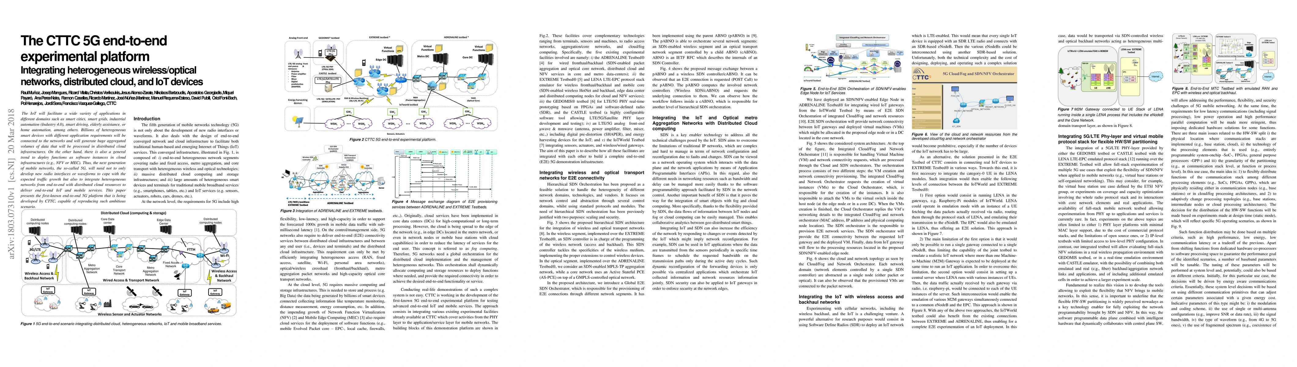 The CTTC 5G end-to-end experimental platform integrates heterogeneous wireless/optical networks, distributed cloud, and IoT devices to simulate next-generation mobile services. This platform aims to replicate complex scenarios involving billions of IoT devices and distributed cloud processing for applications like smart cities and industrial automation.