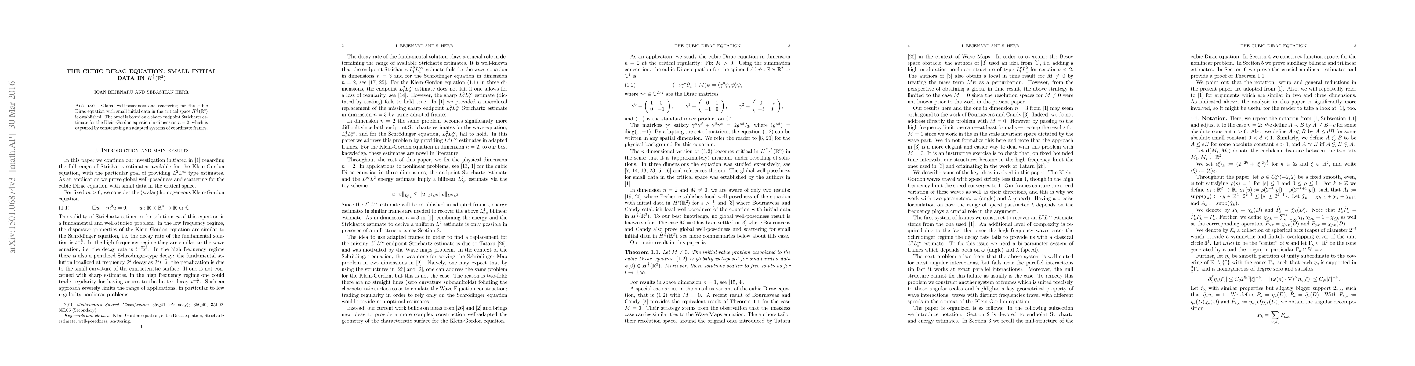 The paper establishes global well-posedness and scattering for the cubic Dirac equation with small initial data in $H^{\frac{1}{2}}(\mathbb{R}^2)$. The proof relies on a sharp Strichartz estimate for the Klein-Gordon equation in two dimensions, achieved by constructing adapted systems of coordinate frames.