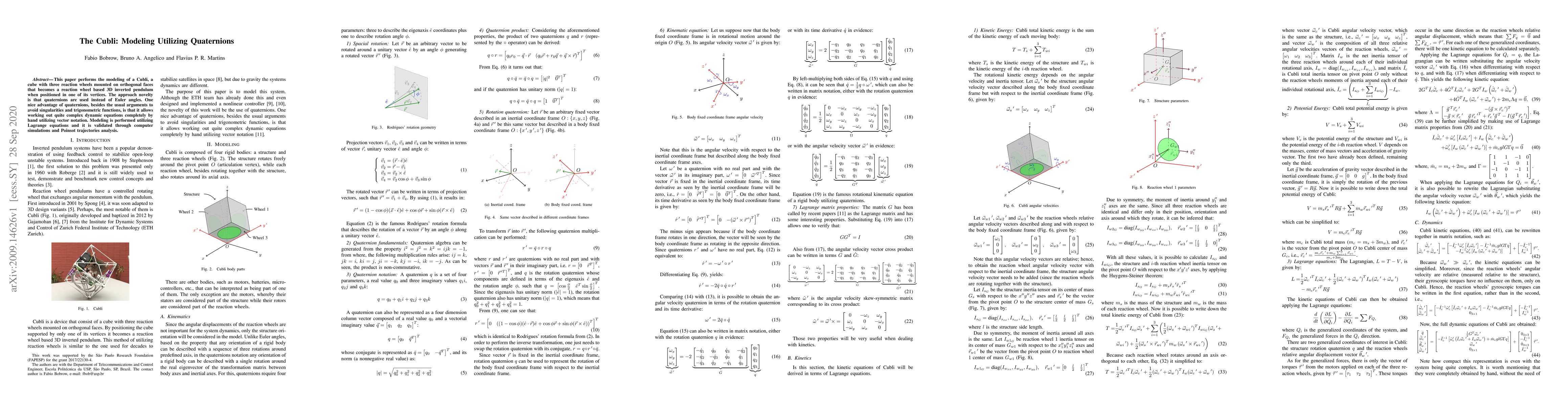 This paper performs the modeling of a Cubli, a cube with three reaction wheels mounted on orthogonal faces that becomes a reaction wheel based 3D inverted pendulum when positioned in one of its vertices. The approach novelty is that quaternions are used instead of Euler angles. One nice advantage of quaternions, besides the usual arguments to avoid singularities and trigonometric functions, is that it allows working out quite complex dynamic equations completely by hand utilizing vector notation. Modeling is performed utilizing Lagrange equations and it is validated through computer simulations and Poinsot trajectories analysis.