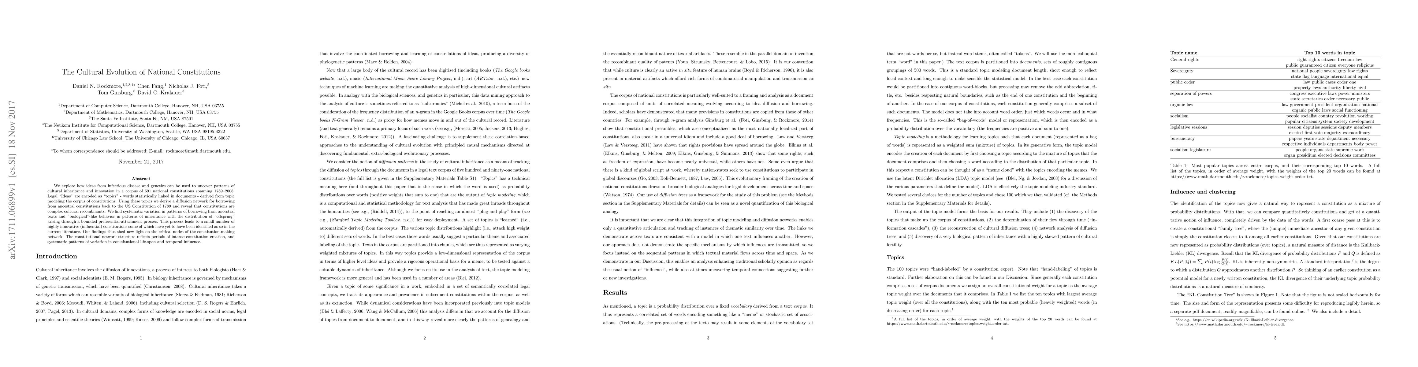 We explore how ideas from infectious disease and genetics can be used to uncover patterns of cultural inheritance and innovation in a corpus of 591 national constitutions spanning 1789 - 2008. Legal "Ideas" are encoded as "topics" - words statistically linked in documents - derived from topic modeling the corpus of constitutions. Using these topics we derive a diffusion network for borrowing from ancestral constitutions back to the US Constitution of 1789 and reveal that constitutions are complex cultural recombinants. We find systematic variation in patterns of borrowing from ancestral texts and "biological"-like behavior in patterns of inheritance with the distribution of "offspring" arising through a bounded preferential-attachment process. This process leads to a small number of highly innovative (influential) constitutions some of which have yet to have been identified as so in the current literature. Our findings thus shed new light on the critical nodes of the constitution-making network. The constitutional network structure reflects periods of intense constitution creation, and systematic patterns of variation in constitutional life-span and temporal influence.