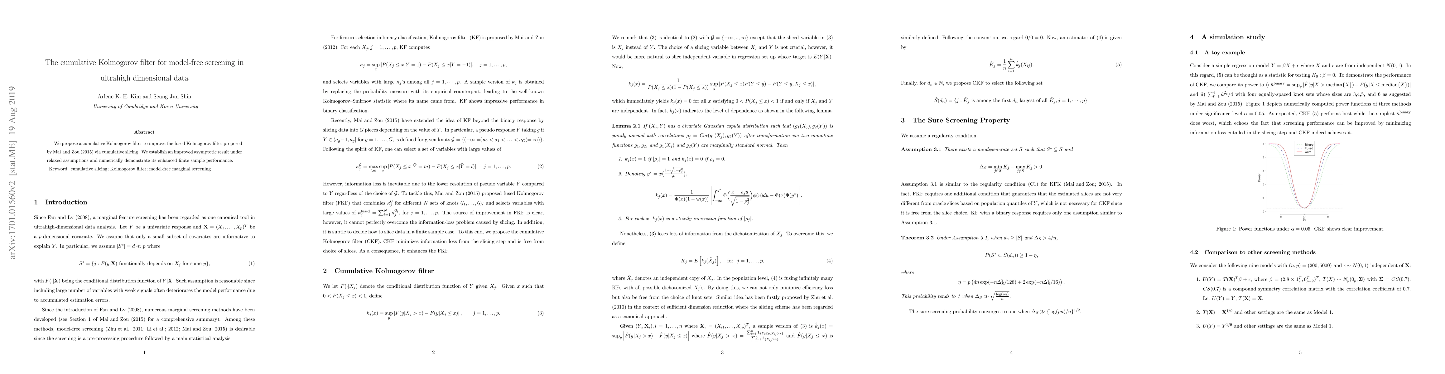 This paper introduces a refined version of the Kolmogorov filter, named the cumulative Kolmogorov filter, for screening ultrahigh dimensional data without relying on models. It improves upon Zou (2015) with cumulative slicing, proves better asymptotic properties under less strict conditions, and shows superior performance in numerical examples.