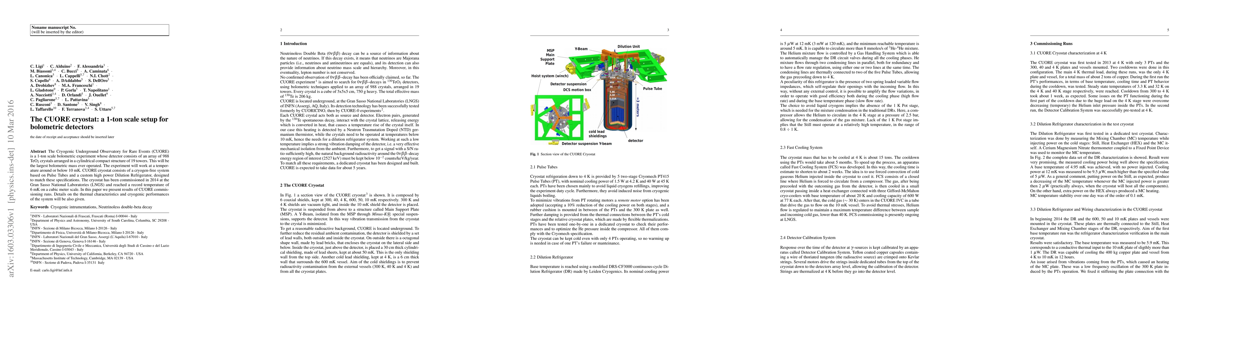 The CUORE experiment features a 1-ton bolometric detector array of 988 TeO2 crystals, achieving the largest bolometric mass ever operated. The cryostat, combining pulse tubes and a high-power dilution refrigerator, reached a record temperature of 6 mK, showcasing its cryogenic performance.