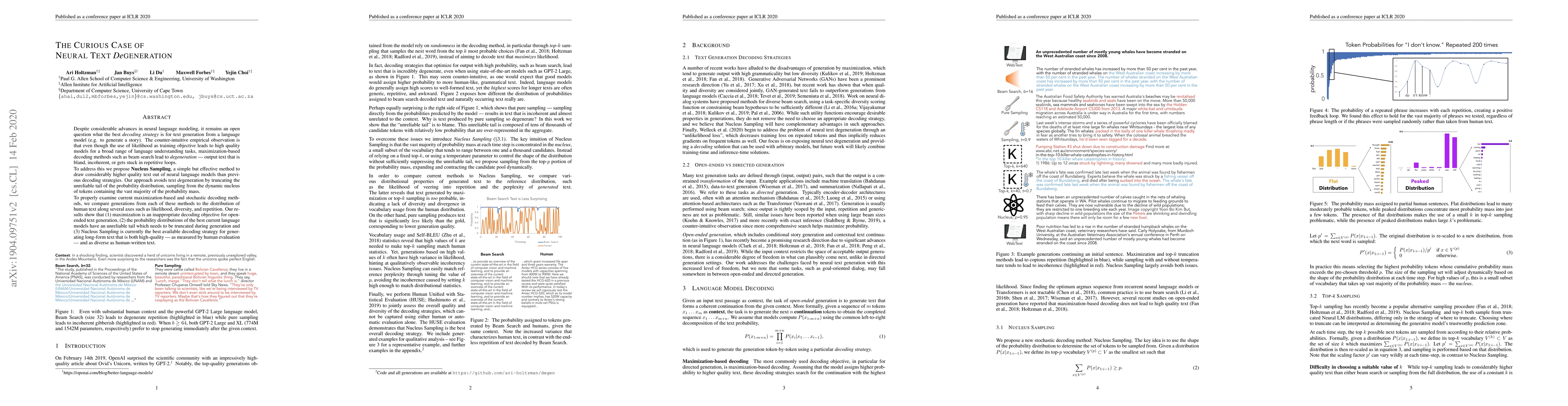 This paper investigates neural text degeneration in deep language models, revealing that despite high-quality language understanding, generated text often becomes bland and repetitive. It proposes Nucleus Sampling as an effective decoding strategy to enhance text diversity while maintaining fluency and coherence.
