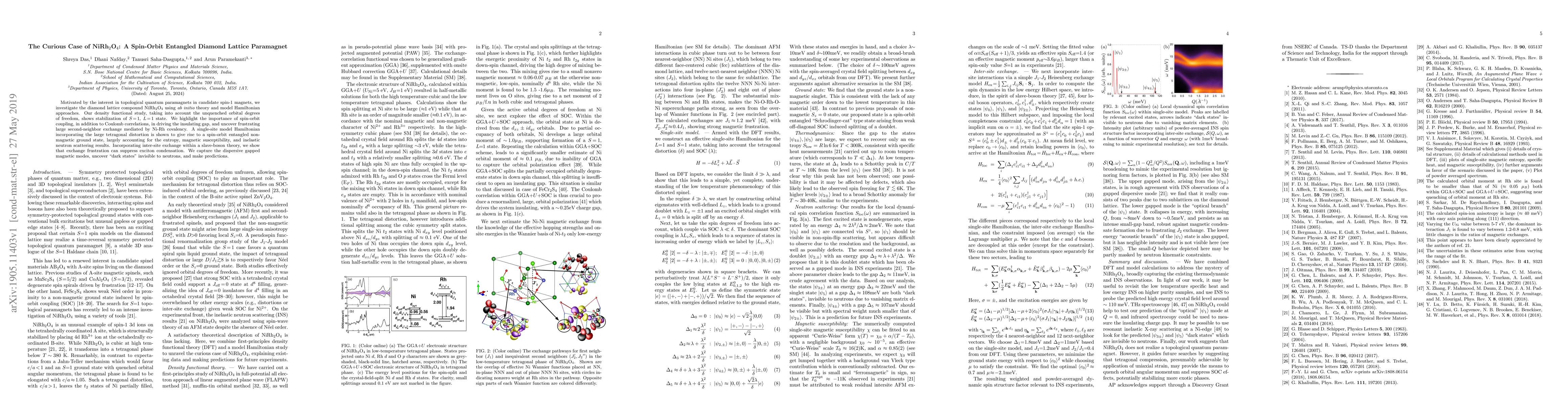 Motivated by the interest in topological quantum paramagnets in candidate spin-$1$ magnets, we investigate the diamond lattice compound NiRh$_2$O$_4$ using {\it ab initio} theory and model Hamiltonian approaches. Our density functional study, taking into account the unquenched orbital degrees of freedom, shows stabilization of $S=1$ and $L=1$ state. We highlight the importance of spin-orbit coupling, in addition to Coulomb correlations, in driving the insulating gap, and uncover frustrating large second-neighbor exchange mediated by Ni-Rh covalency. A single-site model Hamiltonian incorporating the large tetragonal distortion is shown to give rise to a spin-orbit entangled non-magnetic ground state, largely accounting for the entropy, magnetic susceptibility, and inelastic neutron scattering results. Incorporating inter-site exchange within a slave-boson theory, we show that exchange frustration can suppress exciton condensation. We capture the dispersive gapped magnetic modes, uncover `dark states' invisible to neutrons, and make predictions for future experiments.